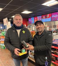 Om lag fire tonn kaffe har blitt kvernet og traktet på Circle K-stasjonene i vestre Agder i år. Øverst på kaffetronen sitter Tom Lindland og kollegene hans i Sira.