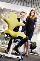 – Det er få selskaper i verden som jobber så helhetlig med miljø og resirkulering som Scandinavian Business Seating (SBS), sier administrerende direktør Jaana Røine i Grønt Punkt. Her med SBS-sjef Lars I. Røiri og stolen HÅG Capisco. Foto: Arash Nejad/nyebilder.no