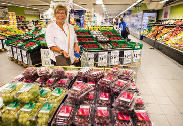 Dagligvarekunde Grete Bjøntegaard (70) fra Kolbotn setter pris på mesteparten av emballasjen hun finner i frukt- og grøntdisken. Foto: Johnny Syversen