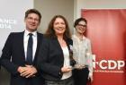 GRØNN LØNN. – Samfunnsansvar gjennomsyrer alle ledd i organisasjonen vår og ligger forankret i de valgene vi tar og de tjenestene vi leverer hver dag, sier Solfrid Skilbrigt, direktør for samfunnsansvar i Steria-konsernet. Her overrekker Pascal Canfin fra World Resources Institute CDP-utmerkelsene til Solfrid Skilbrigt (i midten) og Jen Rodvold, som jobber med bærekraftrådgivning i Steria.