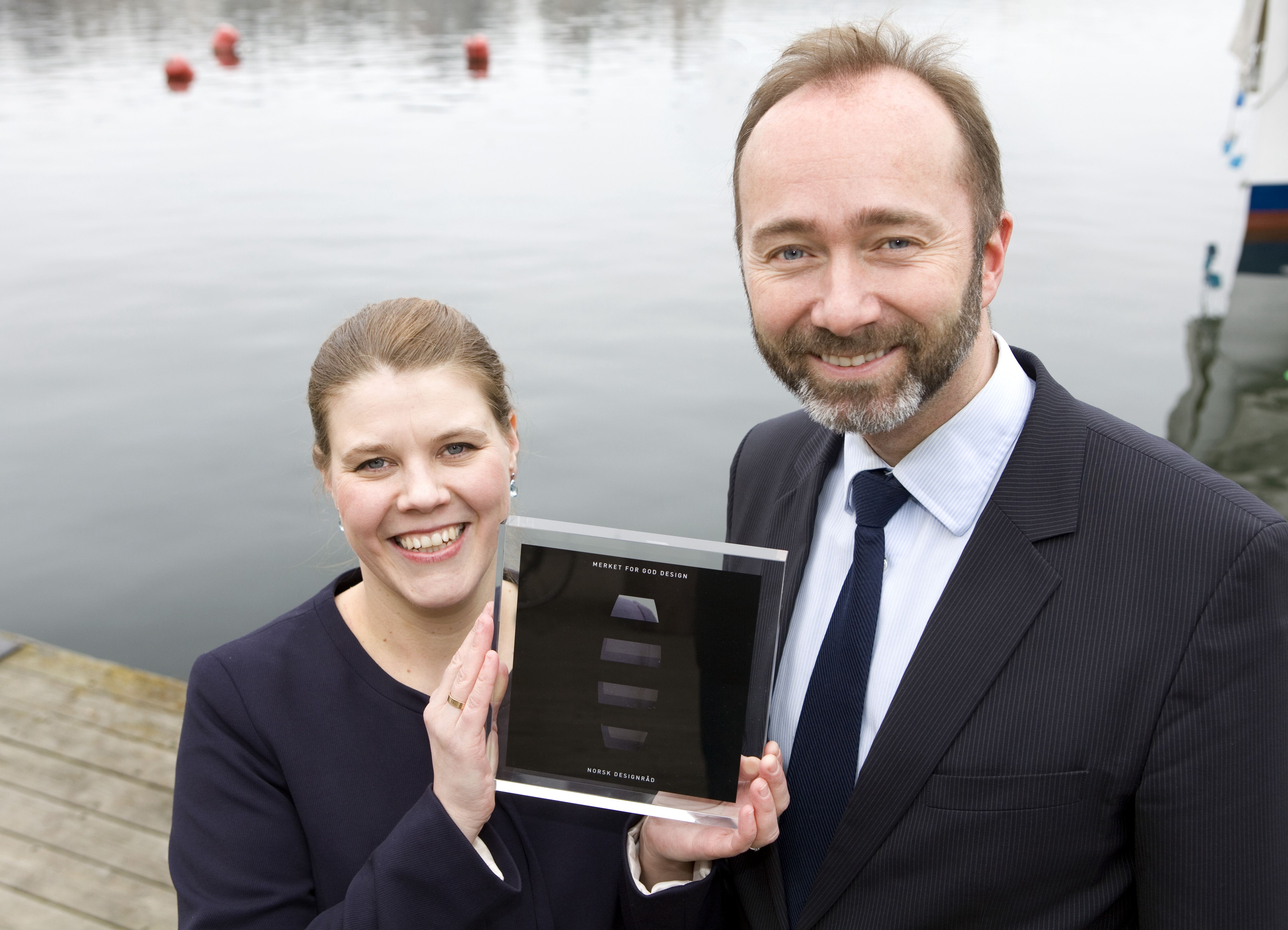 NYE NSB-TOG: Næringsminister Trond Giske gleder seg til å prøve NSBs nye togstorsatsing. Her med Marte Grevsgard fra Norsk Designråd samt plaketten for Hedersprisen for god design. Foto: Johnny Syversen