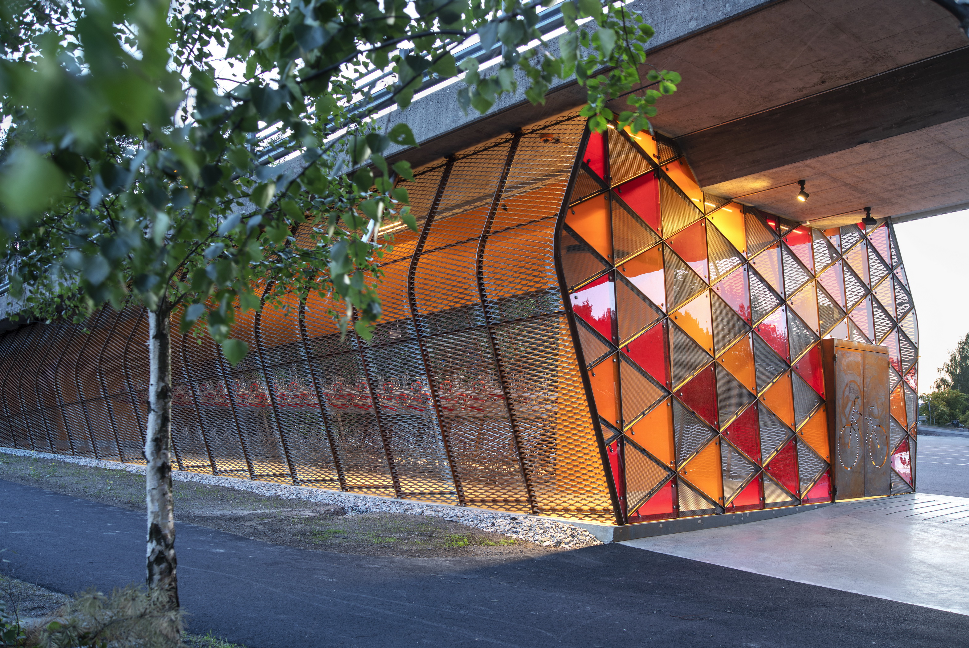 Oker Arkitektur har stått for utformingen av sykkelhotellet, som knytter seg til eksisterende infrastruktur i området ved hjelp av ramper og gangveier. Material- og fargebruk er inspirert av jernbanens estetikk, og hotellet er lagt under Rosenholmbrua. Et område som ellers ville ligget brakk utnyttes nå på en innovativ måte.