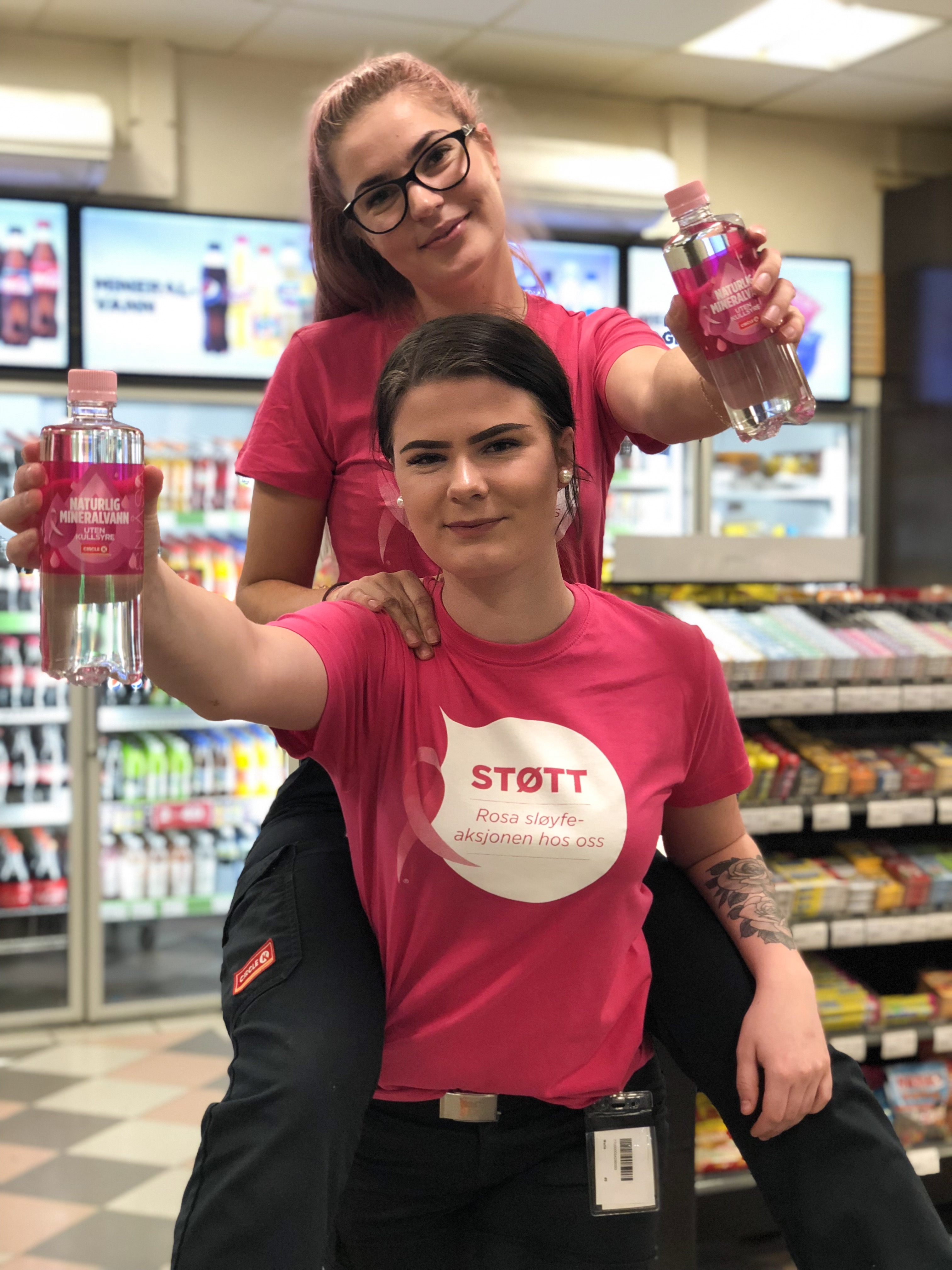 Ansatte på Circle K Fagernes-Narvik byr på rosa vann, spesiallaget for Rosa sløyfe-aksjonen.