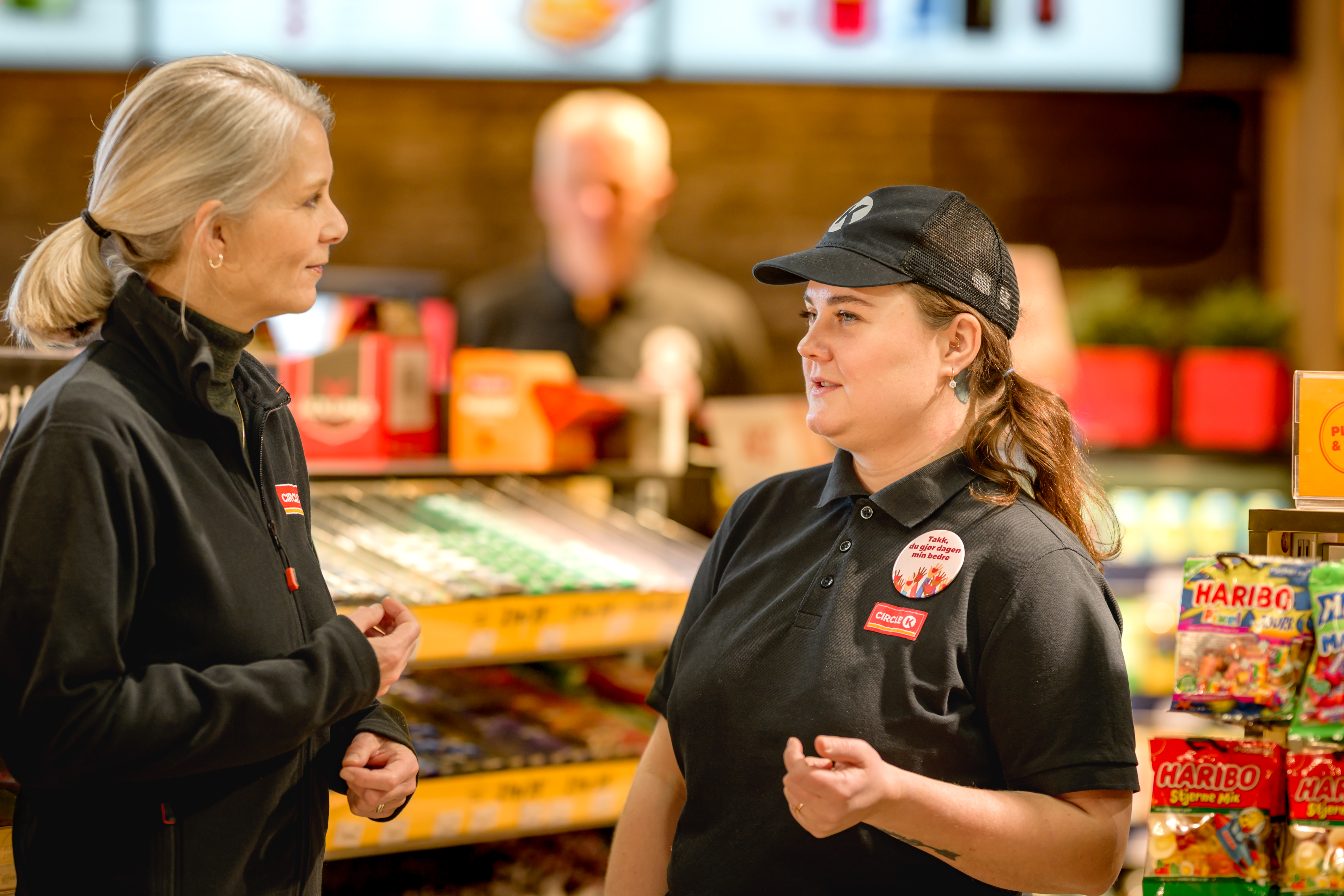 DE ALLER FLESTE ER ÅLREITE… Men noen få kunder skaper uhygge på stasjonen, konstaterer Nina Sandsbråten (t.v.) i Circle K, som her er i samtale med Justine Klindzina på Circle K Smestad. Foto: Terje Borud