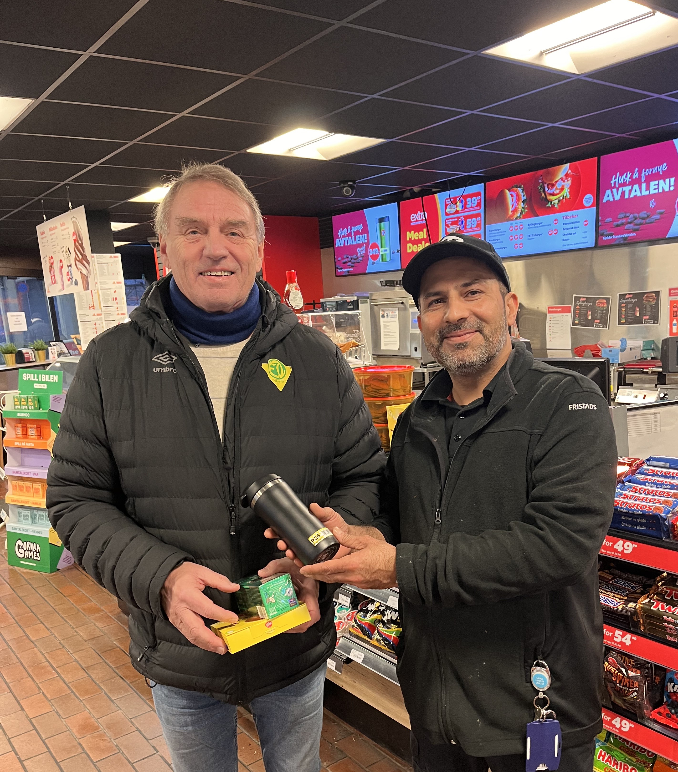HYLLER HYGGELIG KUNDE I KRISTIANSAND. Denne kunden sprer god stemning på Circle Ks stasjoner. Nå hedres Per Knut Lunde av butikkmedarbeider Muhammad Rafiq på Circle K Elvegaten med inngravert gledessprederkopp. Foto: Privat