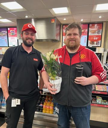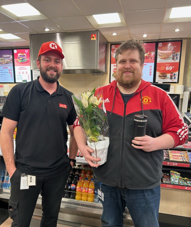 – Anders Sandvik Hansen er en kunde som alltid er positiv og tar seg tid til en prat. Han ble oppriktig glad for Gledesspreder-koppen, og syntes det var fint å høre at han bidrar til en bedre arbeidsdag for oss, sier stasjonssjef Edith Skogum i Circle K Florø.