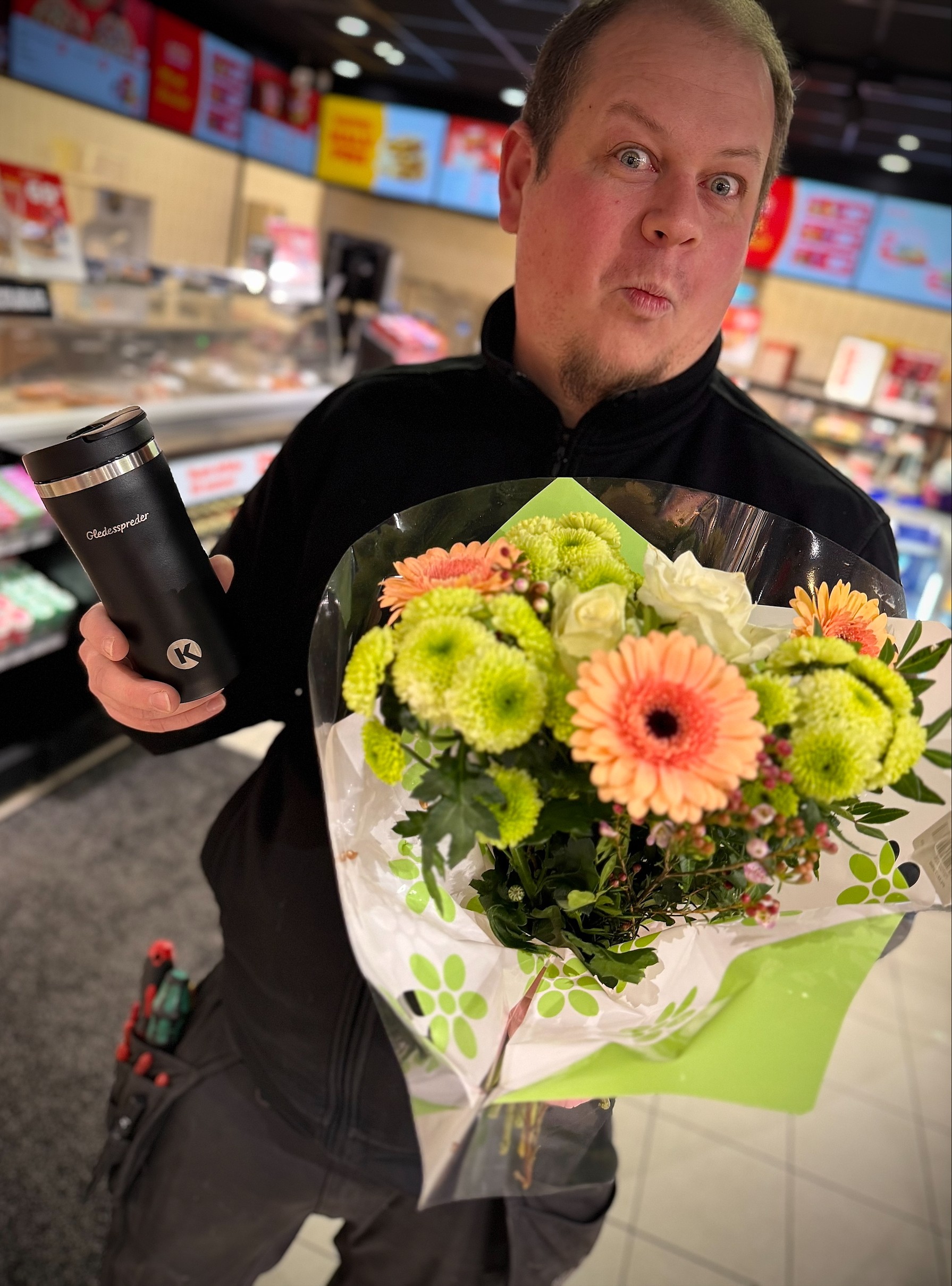 HYGGE PÅ RYGGE. Denne kunden sprer god stemning på Circle Ks stasjoner. Nå hedres Magnus Sandvei av Martine Klubben og Karoline Star på Circle K Rygge med inngravert gledessprederkopp. Foto: Privat
