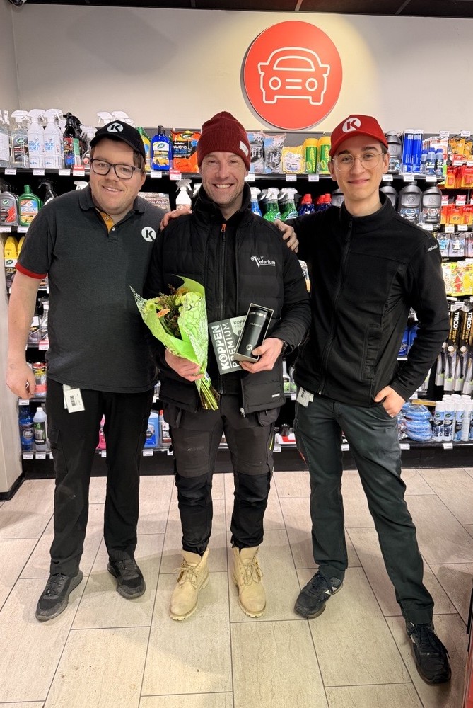 FÅR PRIS PÅ ØKERN. Circle K Økern har kåret Simon Salamonsen Riis til sin hyggeligste kunde. På bildet f.v. Ole Tobias Jacobsen, Simon Salamonsen Riis og Marcel Stankiewicz-Stirna. Foto: Privat