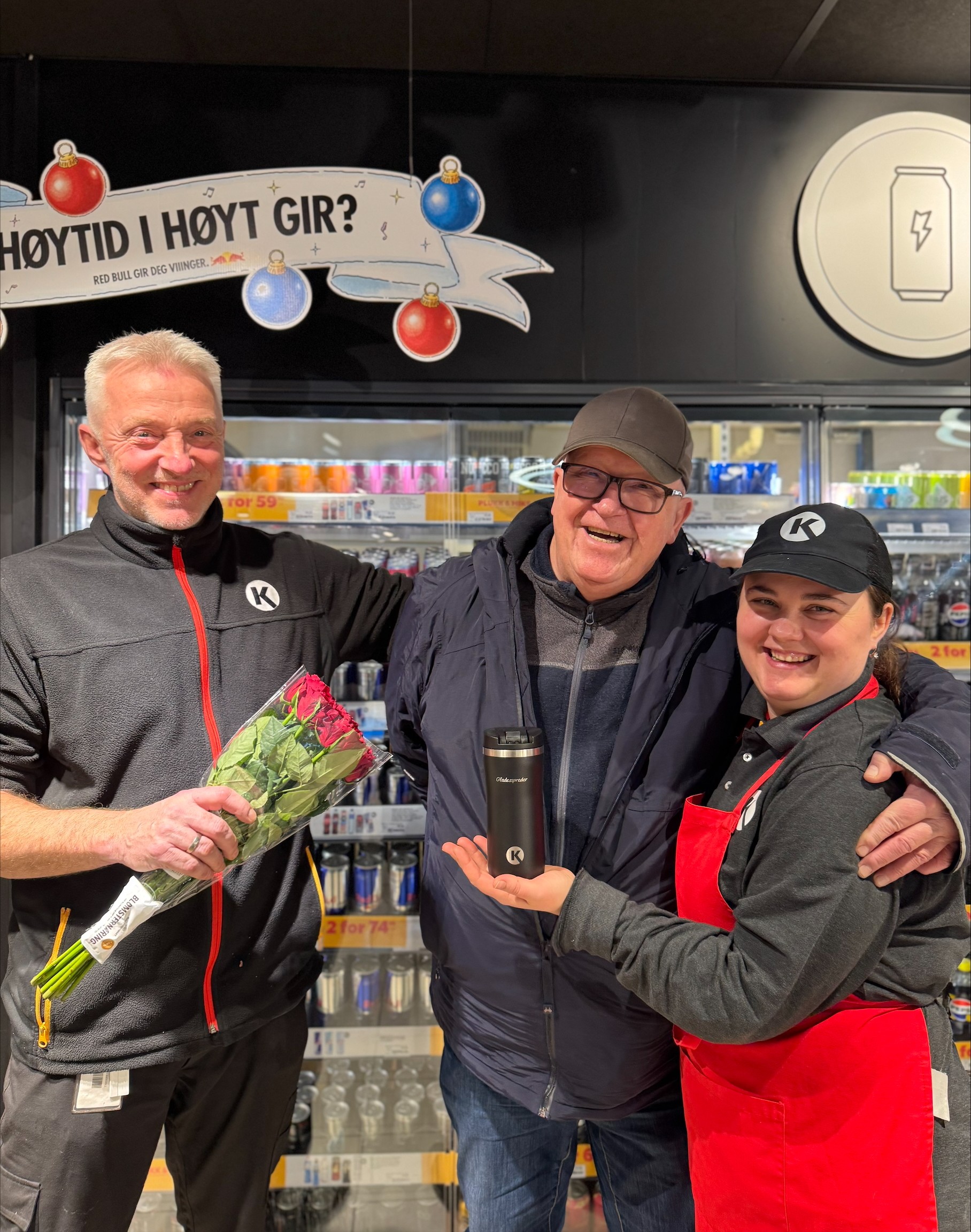 HYLLER HYGGELIG KUNDE PÅ SMESTAD. Denne kunden sprer god stemning på Circle Ks stasjoner. Nå hedres Jan Flaa av Morten Kristiansen og Justine Klindzina på Circle K Smestad med inngravert gledessprederkopp. Foto: Privat