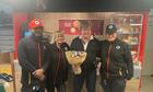 GLEDESSPREDER PÅ BRYN. Egil Dahl mottar gledessprederkopp av Fikadu Weldermariam, Lise Lundsten og Hanne Kristin Åssveen Aamodt på Circle K Bryn. Foto: Privat