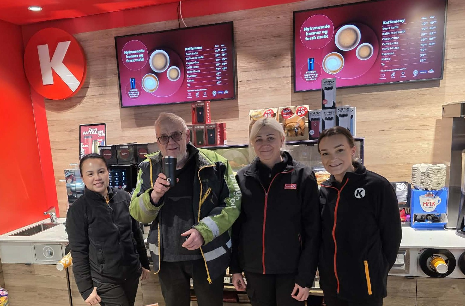 HYLLER HYGGELIG KUNDE I SKIBOTN. Denne kunden sprer god stemning på Circle Ks stasjoner. Nå hedres Hans Johan Breivik av Roselee Senagan, Nina Manko og Eline Steinnes på Circle K Skibotn med inngravert gledessprederkopp. Foto: Privat