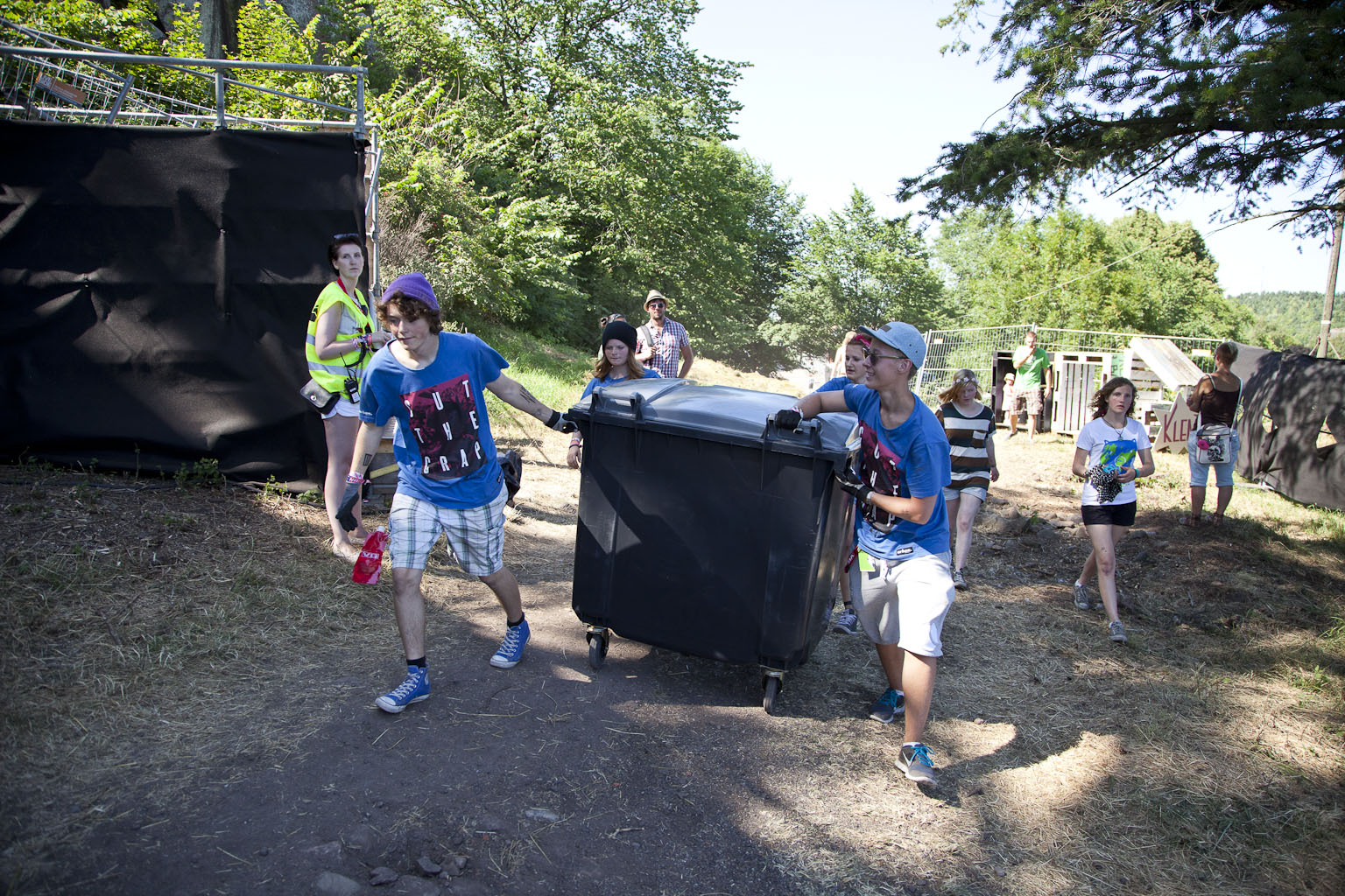 FESTIVALAVFALL. Renovasjonsgjengen på Slottsfjell i aksjon under fjorårets festival. Glass og plast sorteres ut i publikumsområdet. Foto: Patrick DaSilva