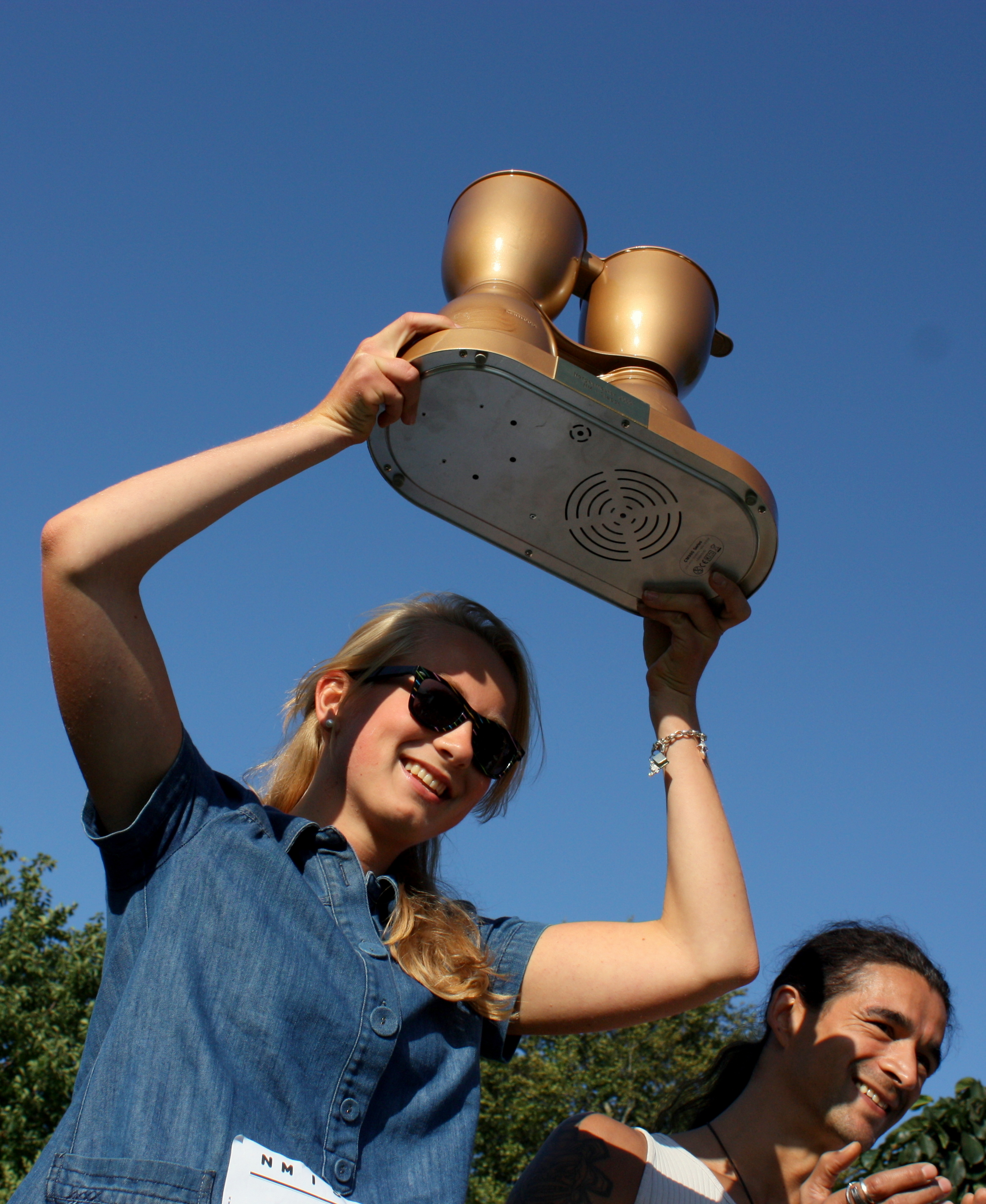 Førstepremien i NM i Slappa var ett års fritt forbruk av kaffe, i tillegg til en noe spesiell pokal: en forgylt kaffetrakter. – Jeg drikker ikke så mye kaffe enda, men mamma og pappa kommer nok til å bli veldig glad for premien, sier Haarberg.