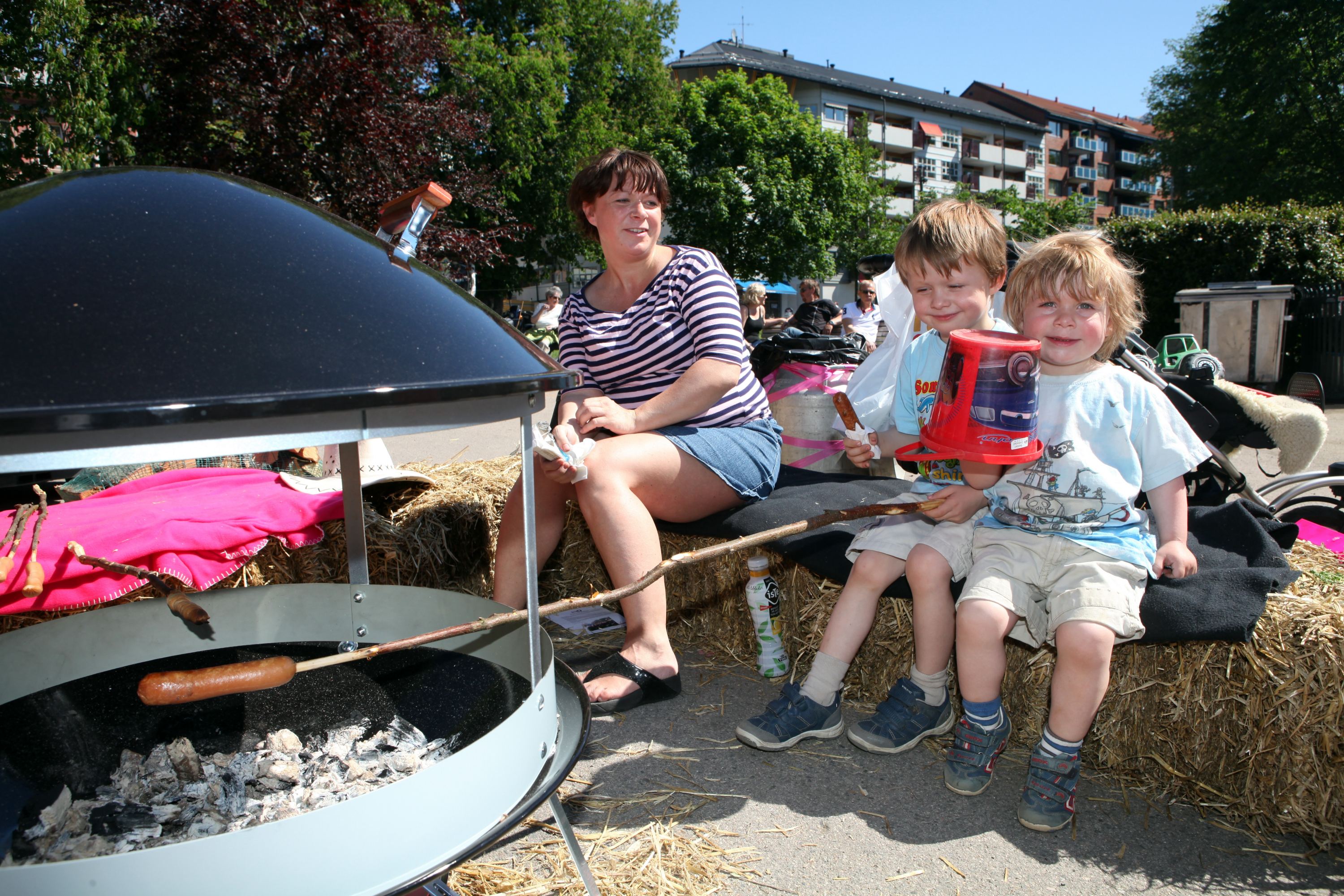 PØLSEGRILLERE: Nikolai (2 ½) og Bastian (4 ½) Grebstad og mor Elin Straume grillet pølser på spyd på standen til Team BarbieQ. Foto: Johnny Syversen