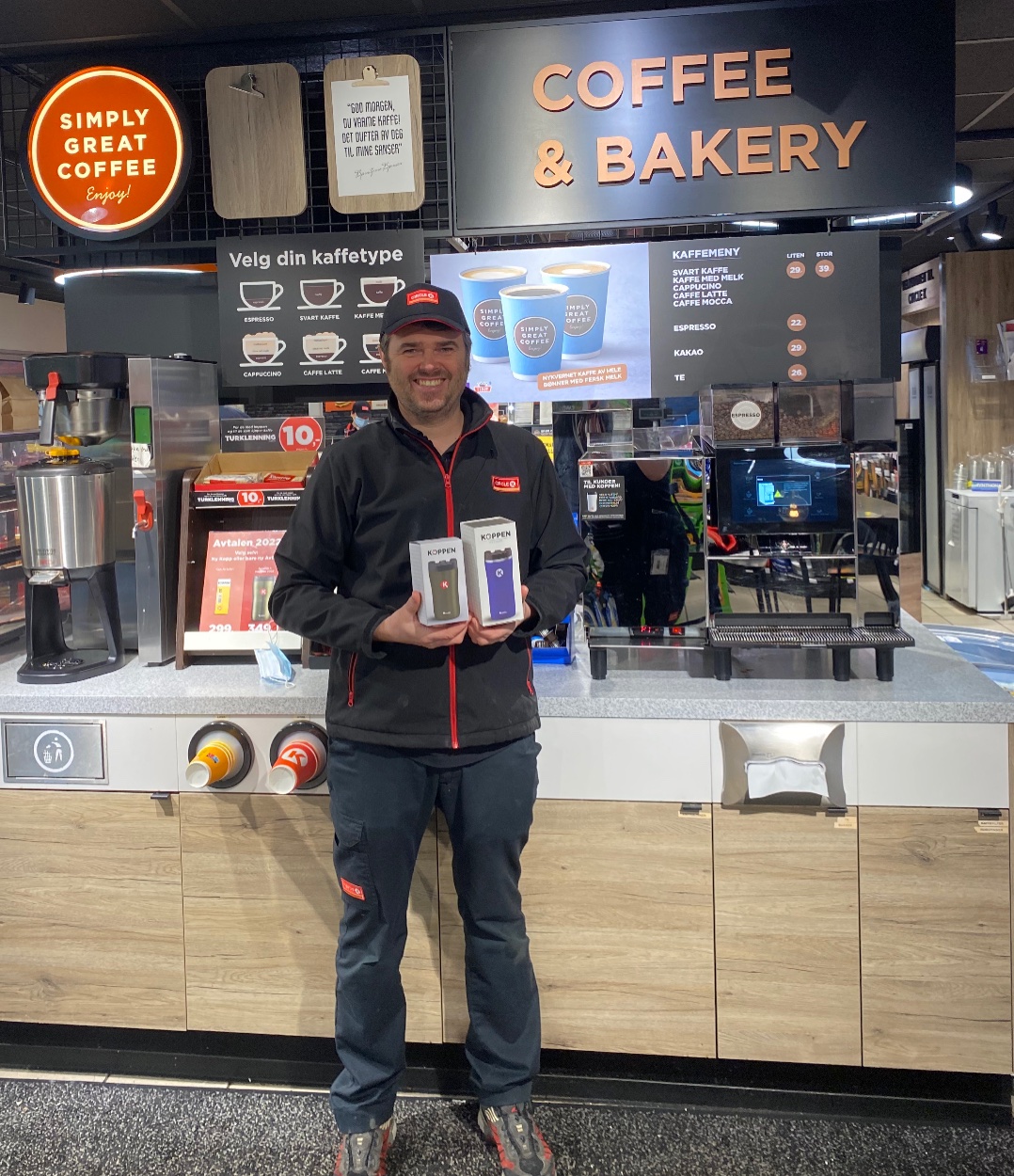 NY KOPP. Kaffekongen Eivind Tomren Ullaland viser fram Koppen 2022, en kopp som eieren kan fylle ubegrenset med varm drikke gjennom hele neste år. Foto: Circle K Moa