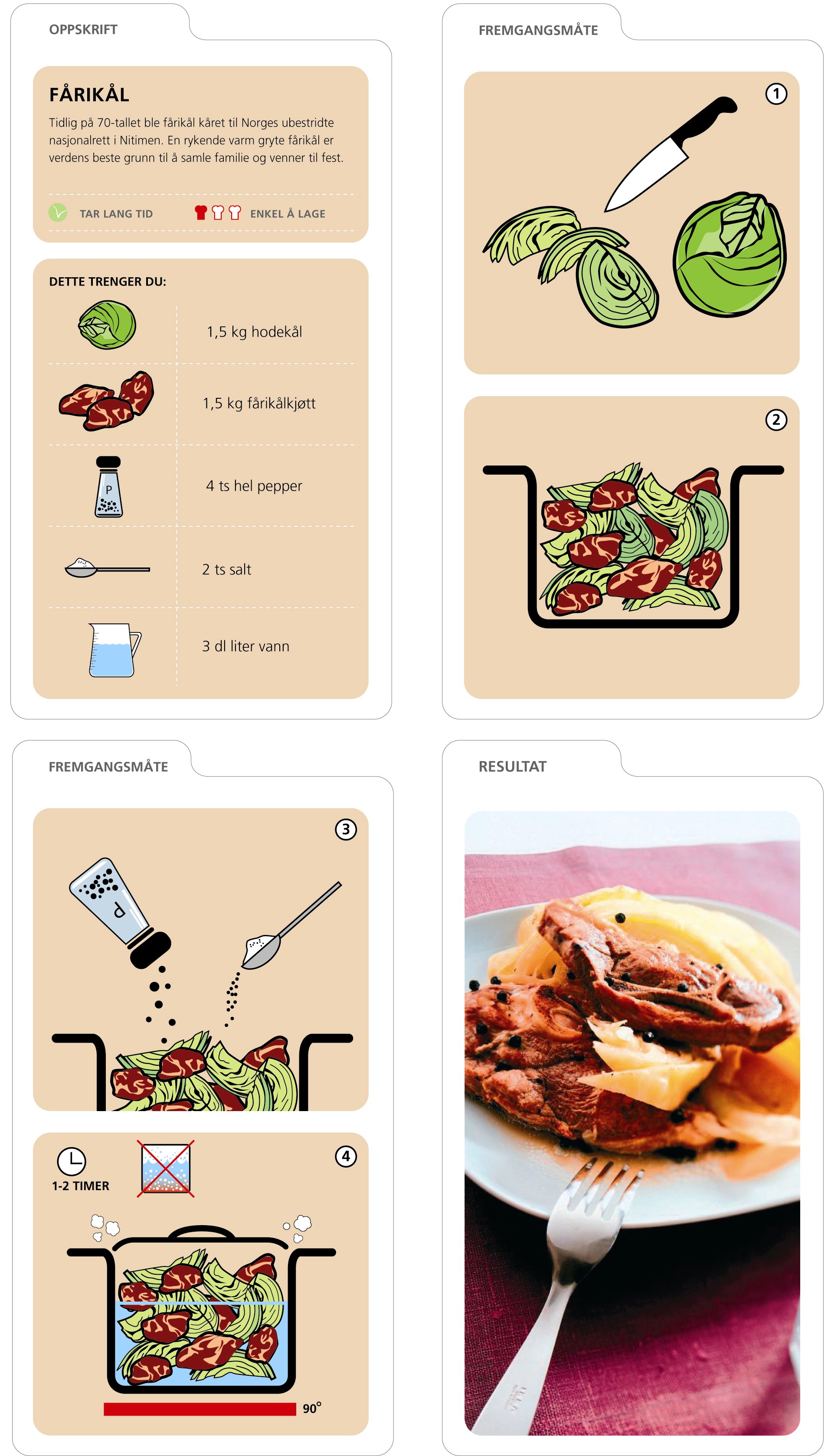Hell på kokende vann. Kok opp og la fårikålen trekke over svak varme til kjøttet er mørt (når kjøttet er mørt løsner det fra benet), cirka 2 timer.
