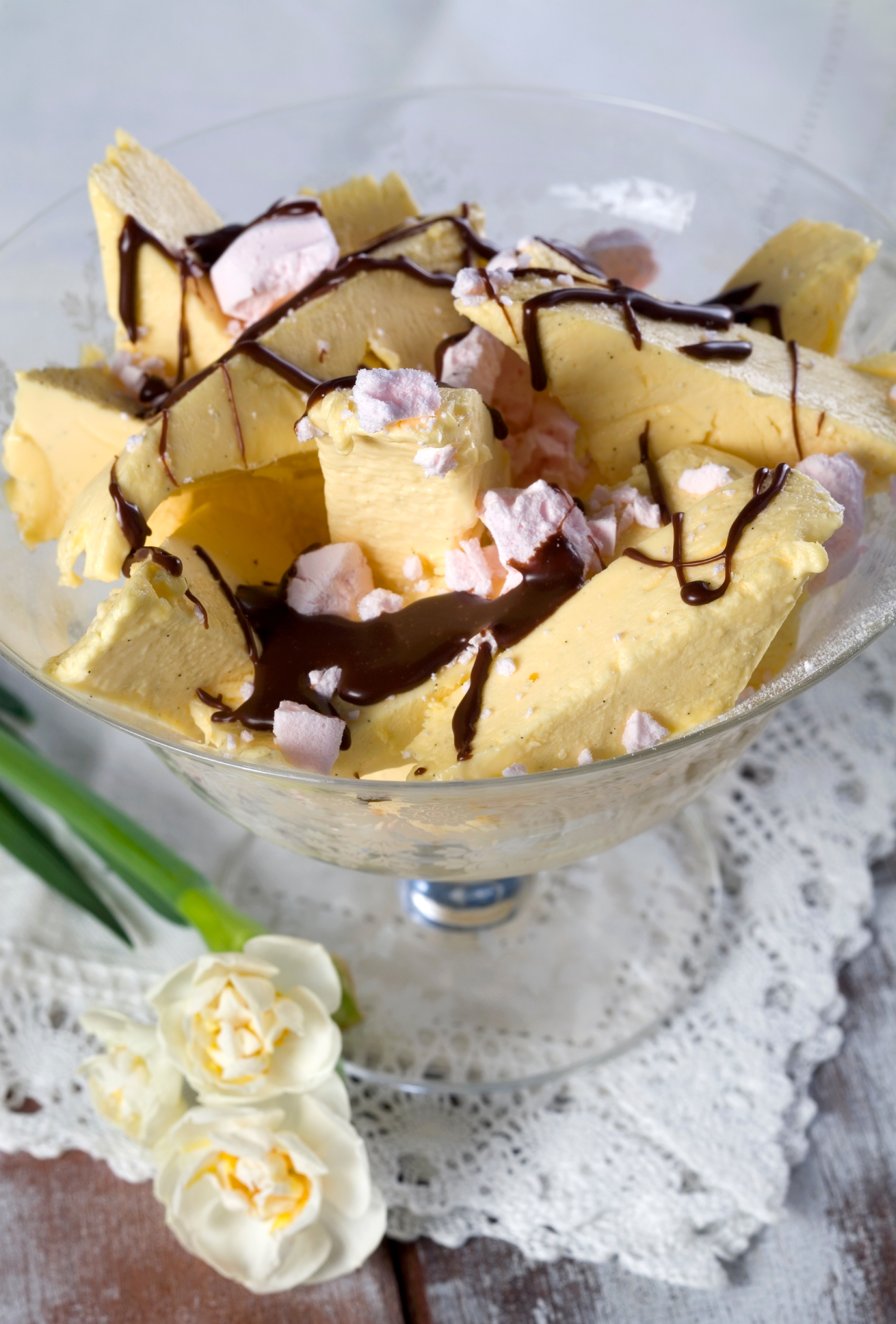 Pisk egg og sukker til eggedosis. Stivpisk kremfløte og vaniljesukker og bland kremen lett inn i eggedosisen. Hell isen i en form og sett den i fryser over natten.