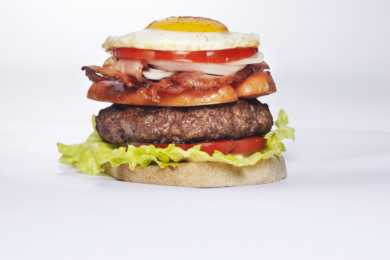 5. Varm hamburgerbrød som anvist på pakken og fyll med salat, tomat, hamburger, pølser, bacon og løk. Topp det hele med et stekt egg.