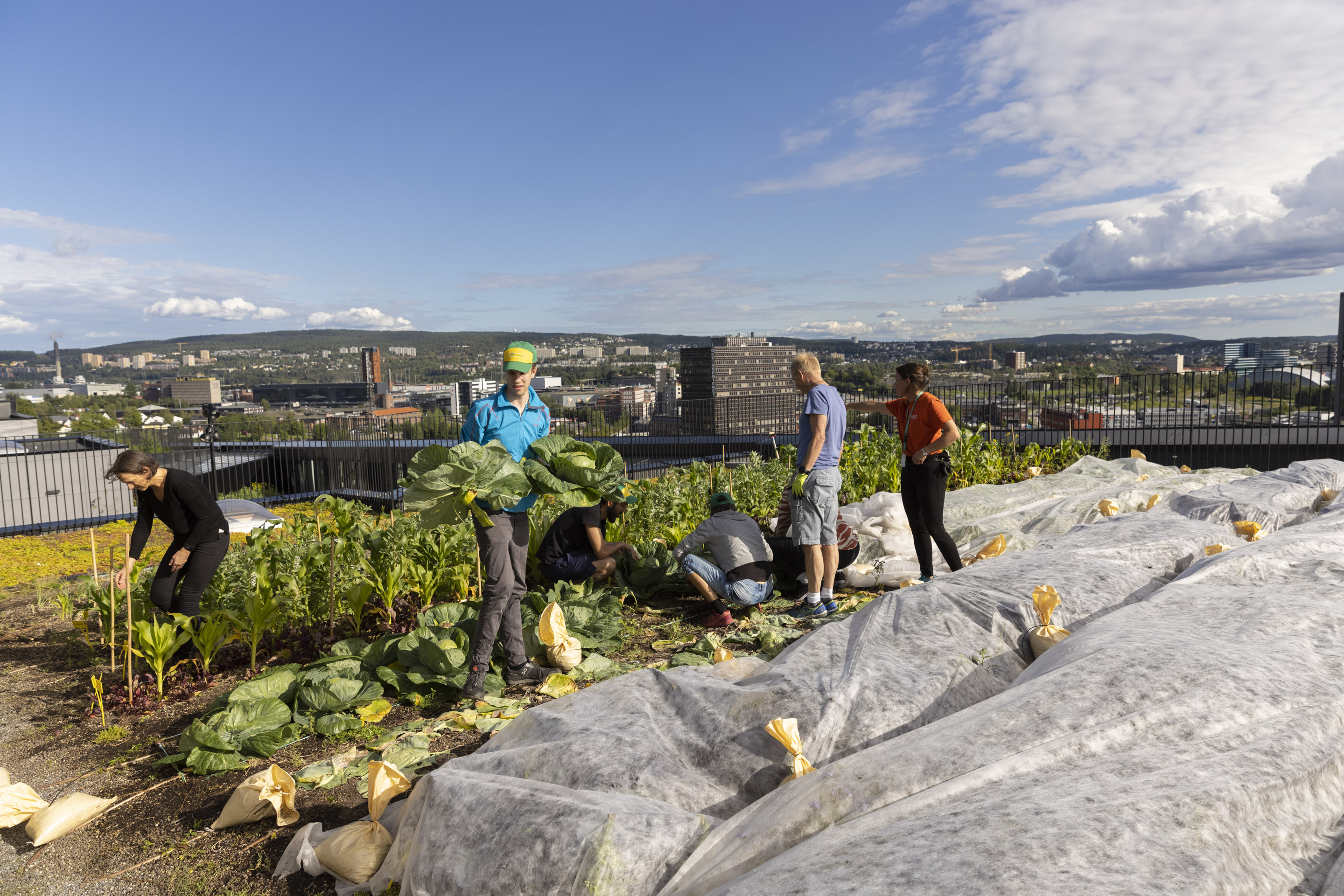 Mens 3000 kontoransatte summer rundt i etasjene under, er et eget dyrkelag ledet av bybonden Liv Opsahl i sving med å bearbeide de øverste 40 centimeterne av det nyreiste nærings- og kulturbygget. Skoler, barnehager og lokalbefolkning valfarter hit for å lære om urbant landbruk.