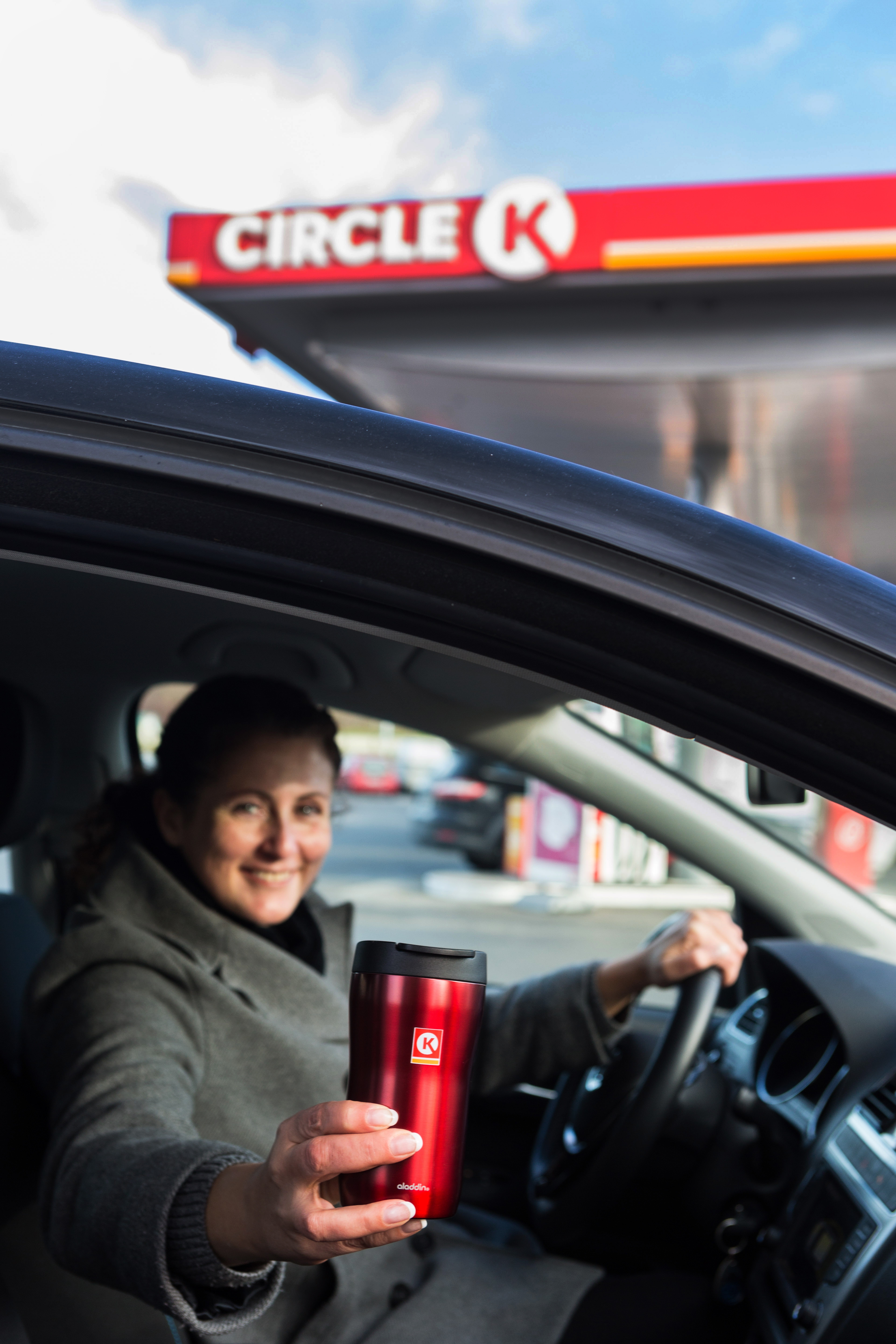 STASJONSKAFFE. 1 av 5 nordmenn foretrekker å kjøpe kaffen på stasjon. En god del av disse har i likhet med Jeanette Amara sin egen kaffeavtalekopp, eller Circle K-kopp, liggende i bilen. Foto: Johnny Syversen