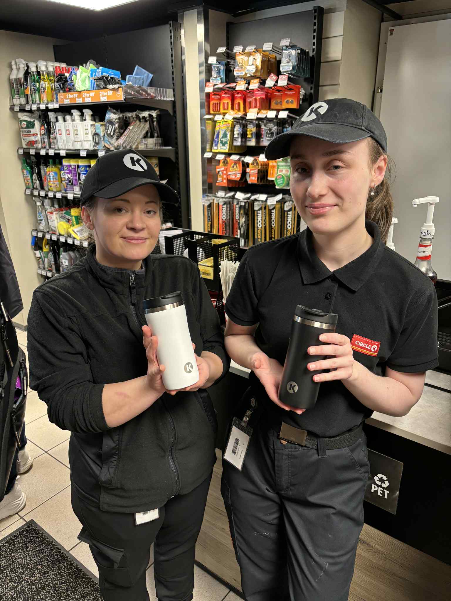 KAFFEDRONNINGER. Rebekka Fagerlid Hopland og kollega Cristel på Circle K Helleveien er størst på kaffe i Bergen og Vestland. Foto: Privat
