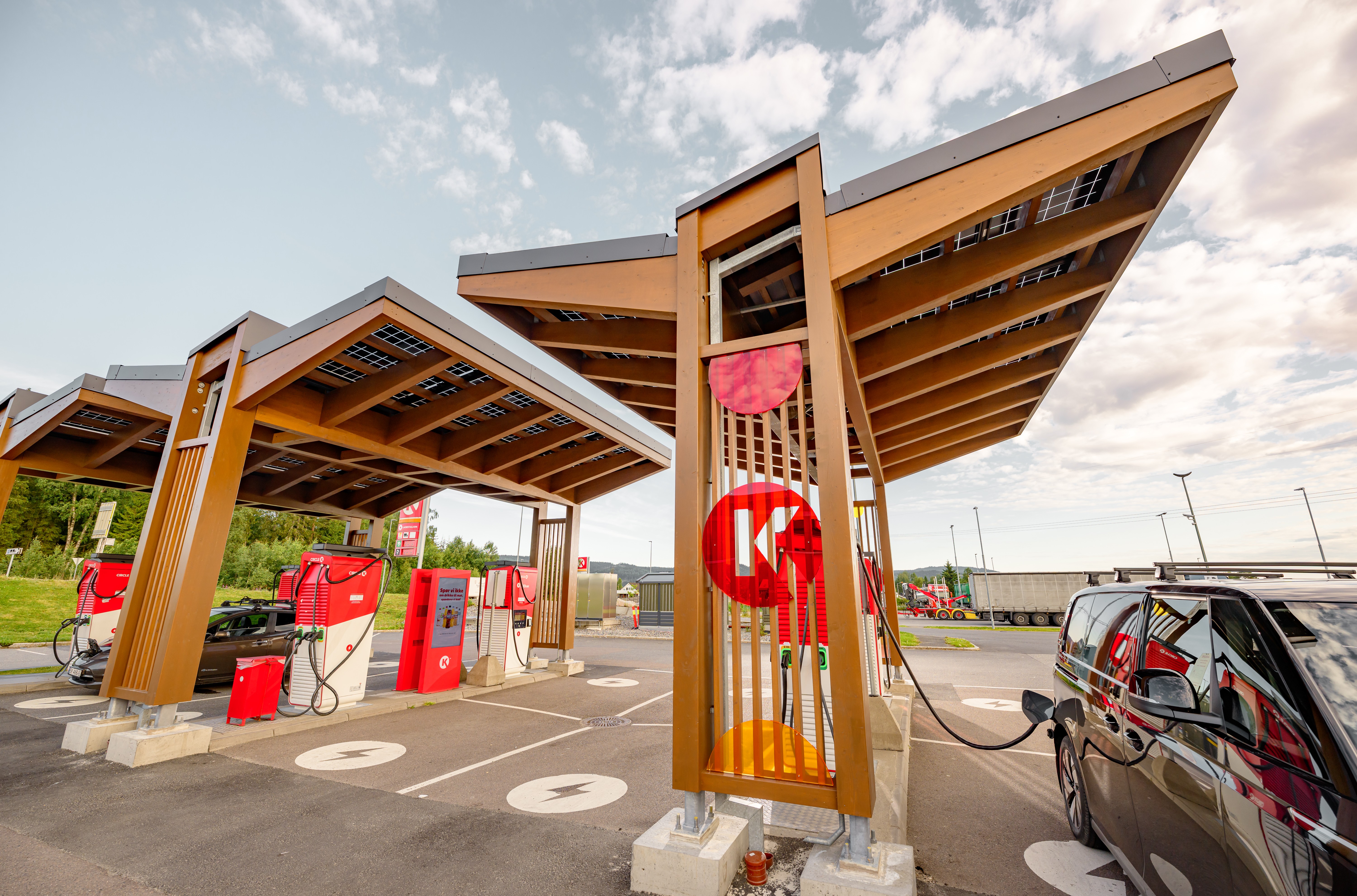 På Minnesund har selskapet derfor bygget et flunkende nytt tak over alle ladeplassene på stasjonen. Laderne henter deler av strømmen fra solceller på taket.