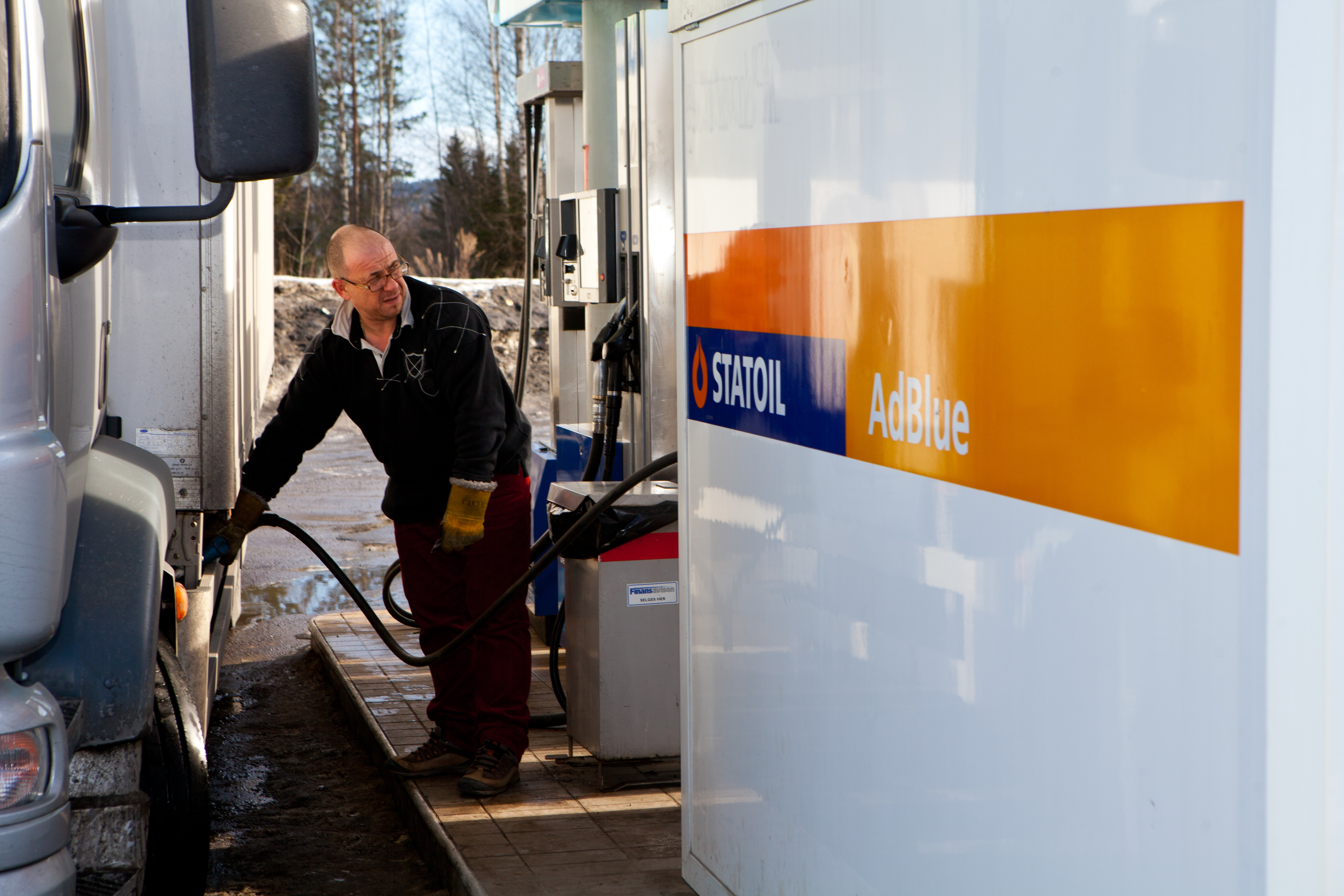 MINDRE NOX-UTSLIPP: Rune Olsen i Plantefoss fyller opp med diesel og AdBlue, et stoff som gjør at 90 prosent av NOx-utslippene i eksosen brytes ned til nitrogen og vanndamp. I fjor solgte Statoil Fuel & Retail 3,5 millioner liter AdBlue, noe som sparte norske veier for utslipp av om lag 1750 tonn NOx. Foto: Johnny Syversen.