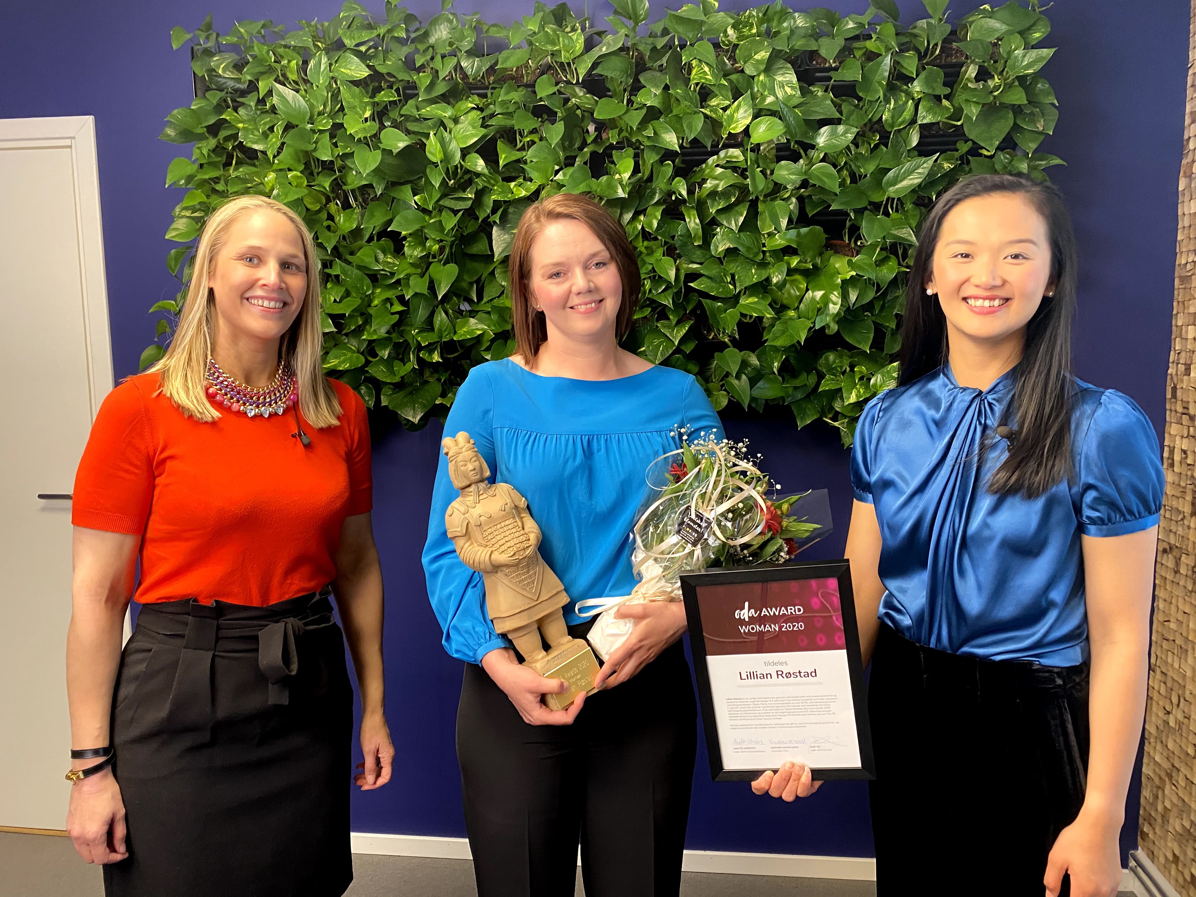 ROLLEMODELL. Lillian Røstad (i midten) mottar prisen Oda Award Woman 2020. Hun flankeres (f.v.) av Kristine Hofer Næss og Jane Xia. Foto: Sopra Steria