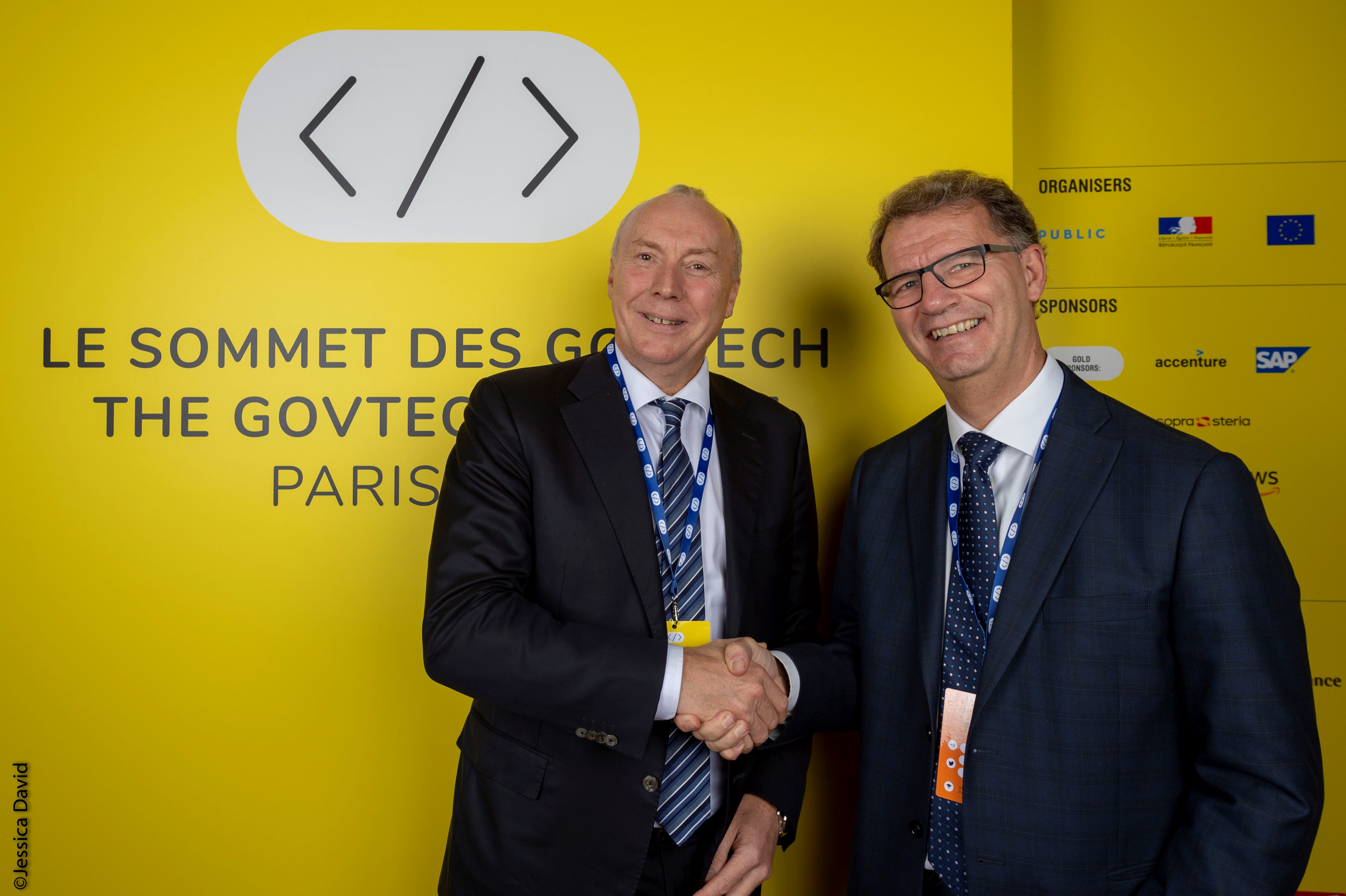 FOLK FØRST. – Digital transformasjon handler om folk, ikke teknologi, fortalte finansbyråd Robert Steen til Claire Ducos, utviklingsdirektør i Sopra Steria Consulting, under mandagens GovTech Summit 2018 i Paris.