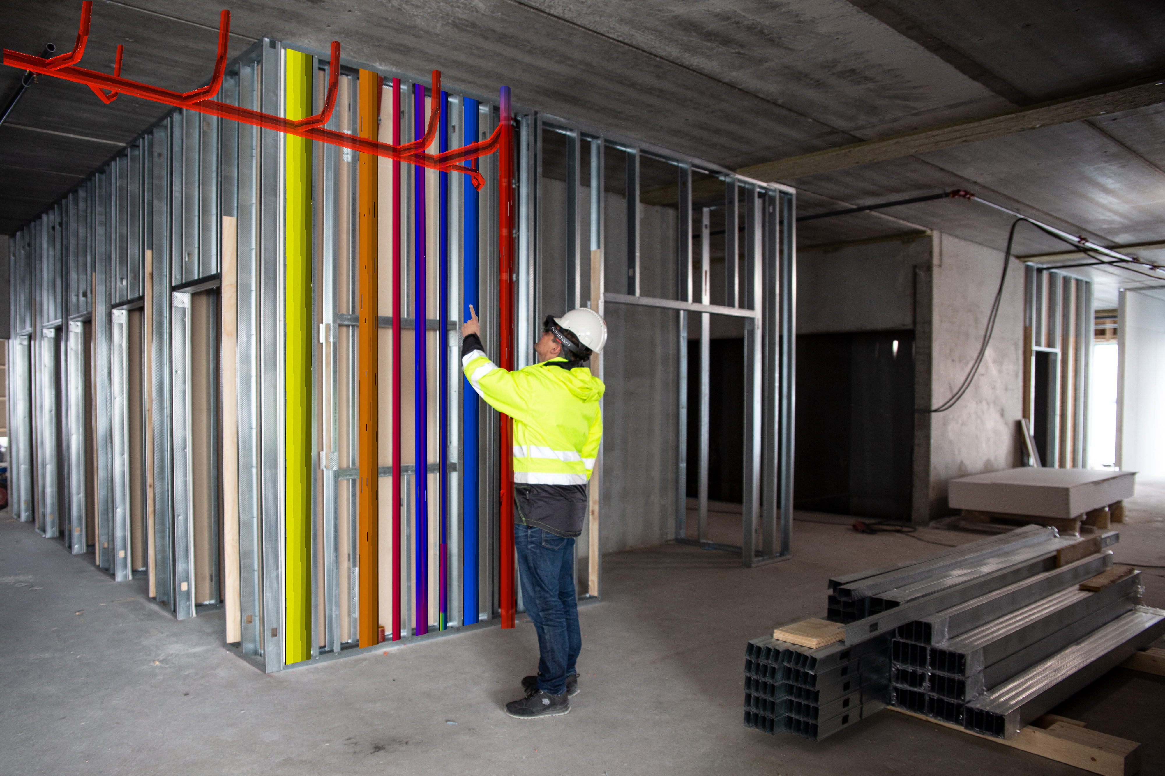 BYGNINGSHOLOGRAM. Ved bruk av HoloLens-teknologi i bygg- og anleggsbransjen kan man «se» strukturer og løsninger før de blir bygget. Foto/illustrasjon: Sopra Steria/Nana Stojanovic