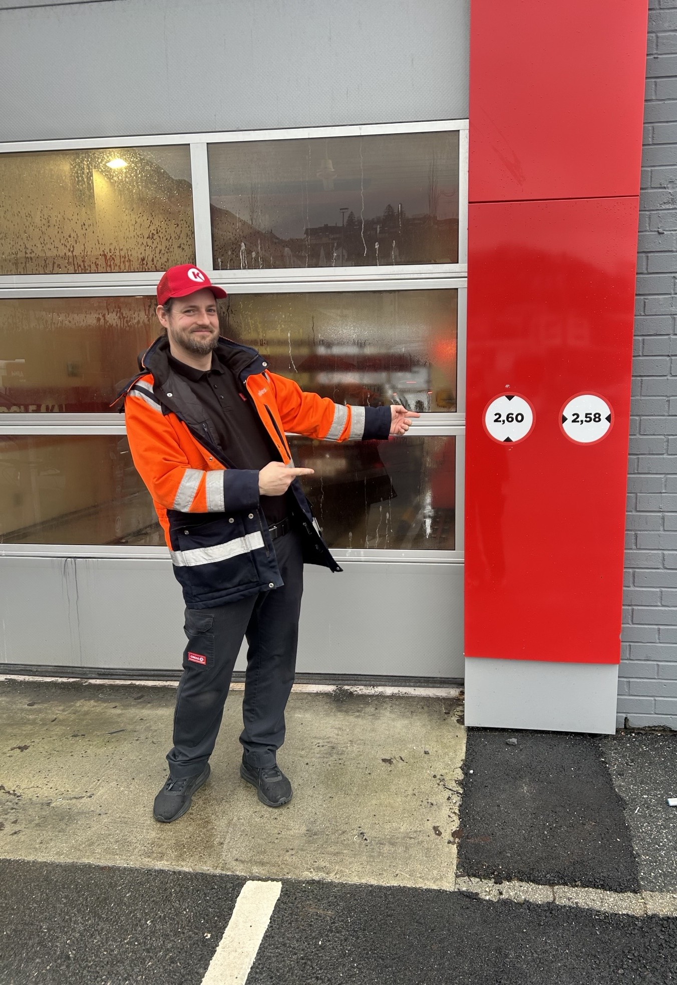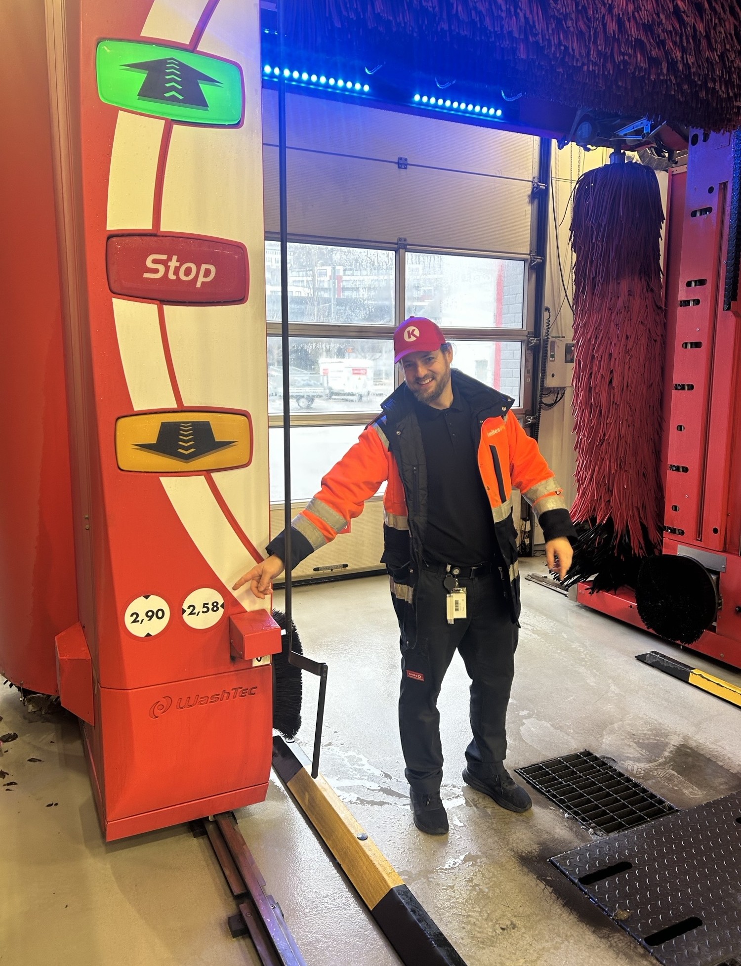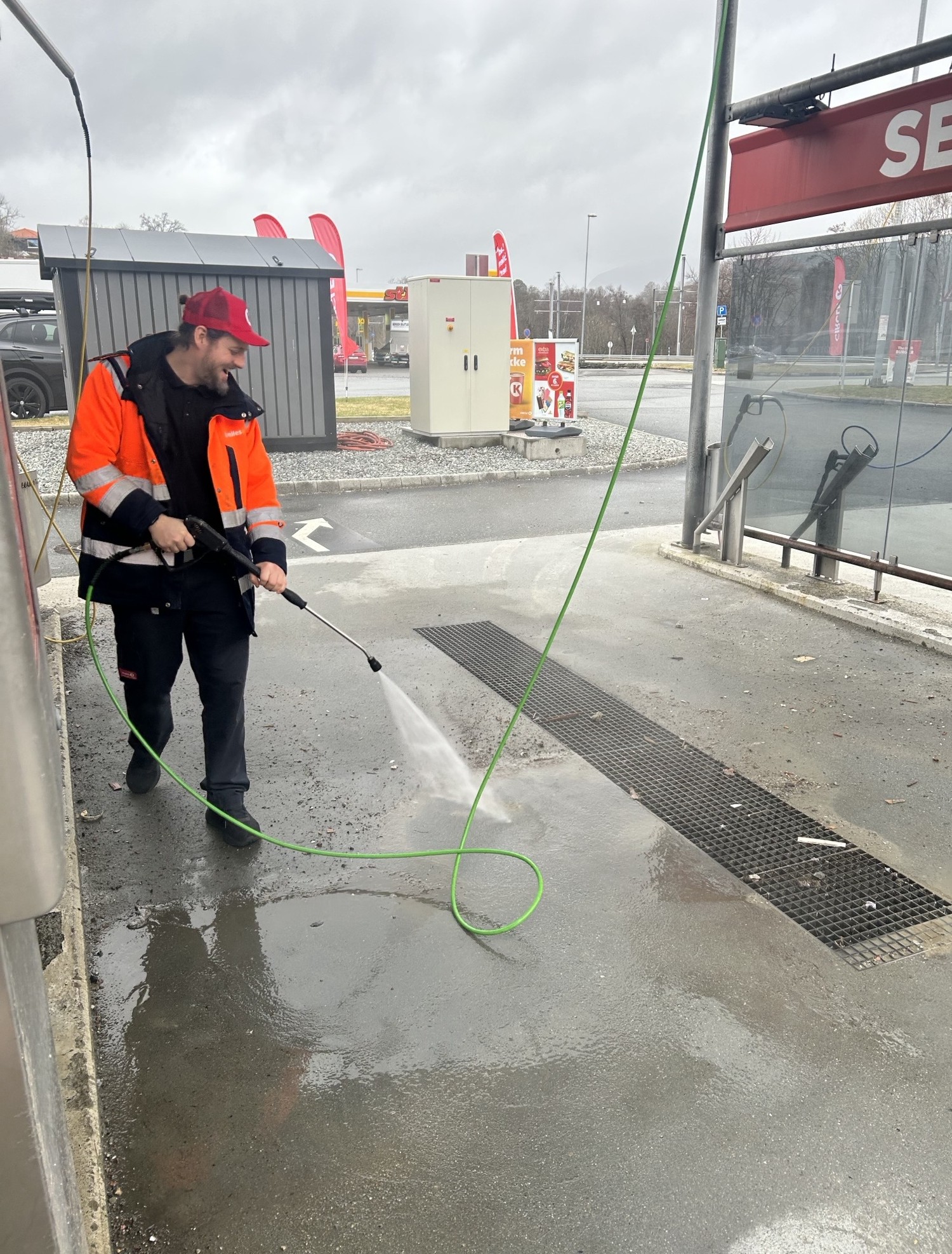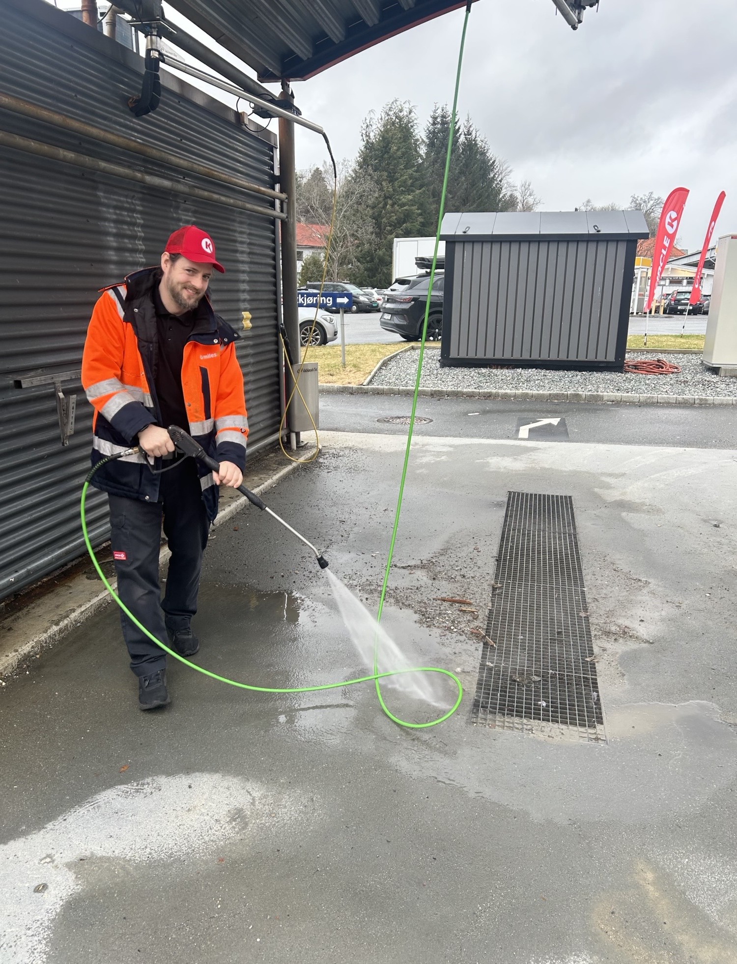 VANNSKILLS. Thomas Drange viser fram vaskeferdighetene på Circle K Nesttun i Bergen. Foto: privat