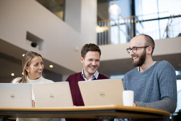 Motiverte ansatte står for en inntjening som i snitt ligger 40 prosent høyere enn hva mindre motiverte kolleger klarer, ifølge en studie. På bildet Leila Laksiri, Atle Jarrett og Petter Songe-Møller, som alle jobber i konsulentselskapet Sopra Steria. Foto: Hanne Kristine Fjellheim