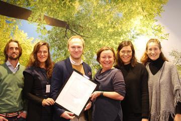 GRØNN SØLVFISK. Grønt Punkt mottok reklameprisen Sølvfisken på tirsdag denne uken. På bildet f.v. konsulent Marius Wold (Alexander Reklamebyrå), adm. dir. Jaana Røine (Grønt Punkt Norge AS), Jeppe Alexander Gillesen Skageng (TV2), Kari-Lill Ljøstad (Grønt Punkt Norge AS), kreativ leder Ying Hau (Alexander Reklamebyrå) og account director Cecilie Skjøren (MediaCom). Foto: Arve Martinsen