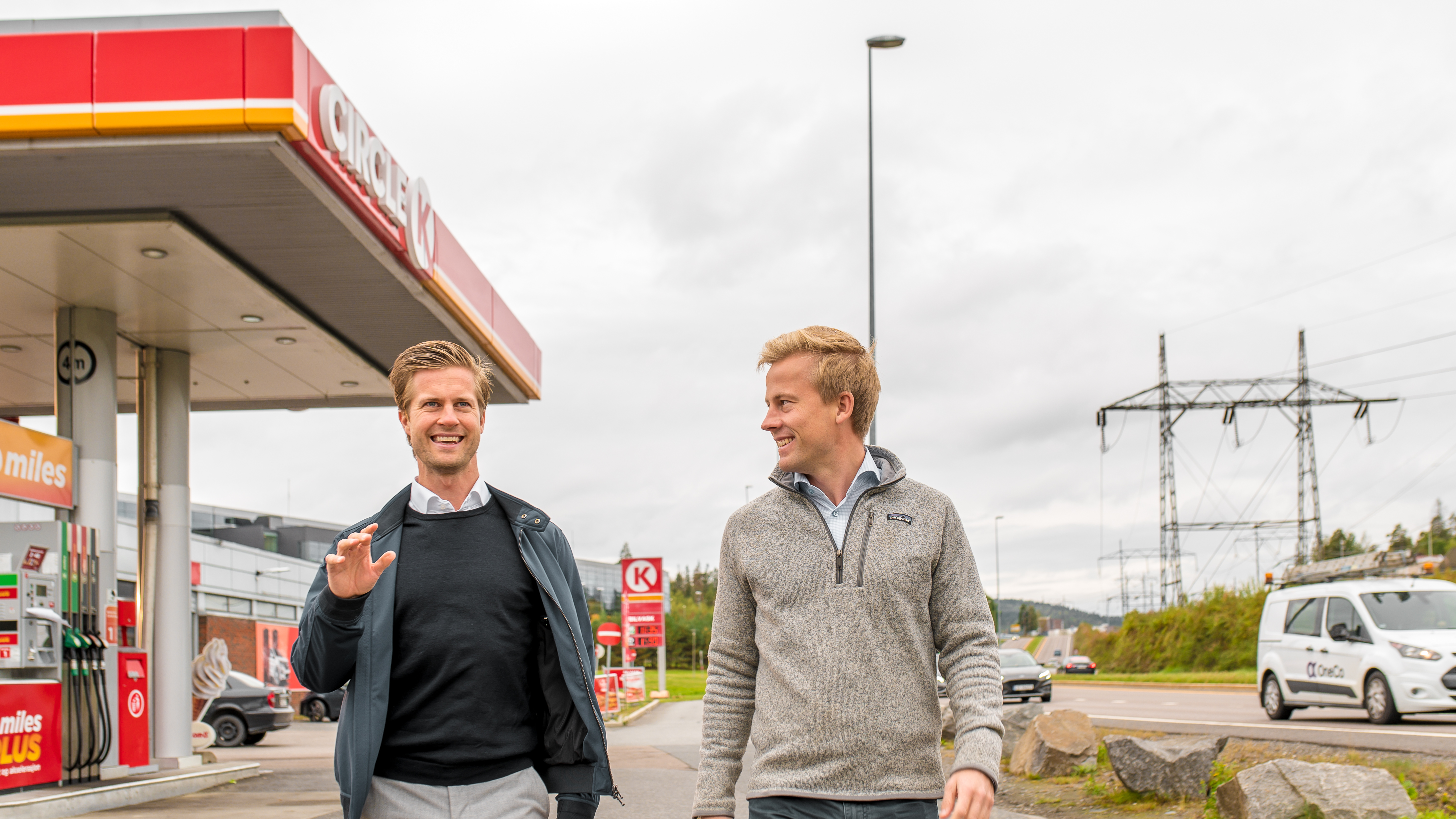 SATSER ELEKTRISK. (f.v.) Joachim Hartmann og Preben Kristiansen skal selge strøm til norske husholdninger. Her utenfor Circle K Lørenskog. Foto: Terje Borud / Circle K Norge
