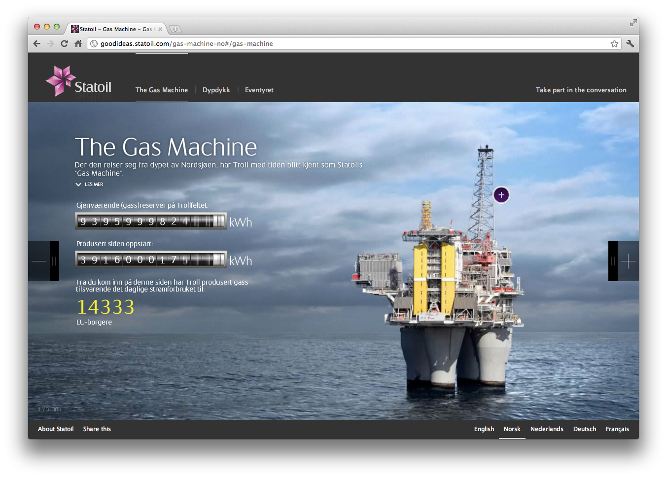 GASSHISTORIEN: Statoil og byråene Scandinavian Design Group, McCann og Mediefront mottok Merket for god design og var dessuten nominert til Hedersprisen for god design for ”The Gas Machine”, en visuell historiefortelling om plattformen Troll A og norsk gassutvinning. Foto: Statoil