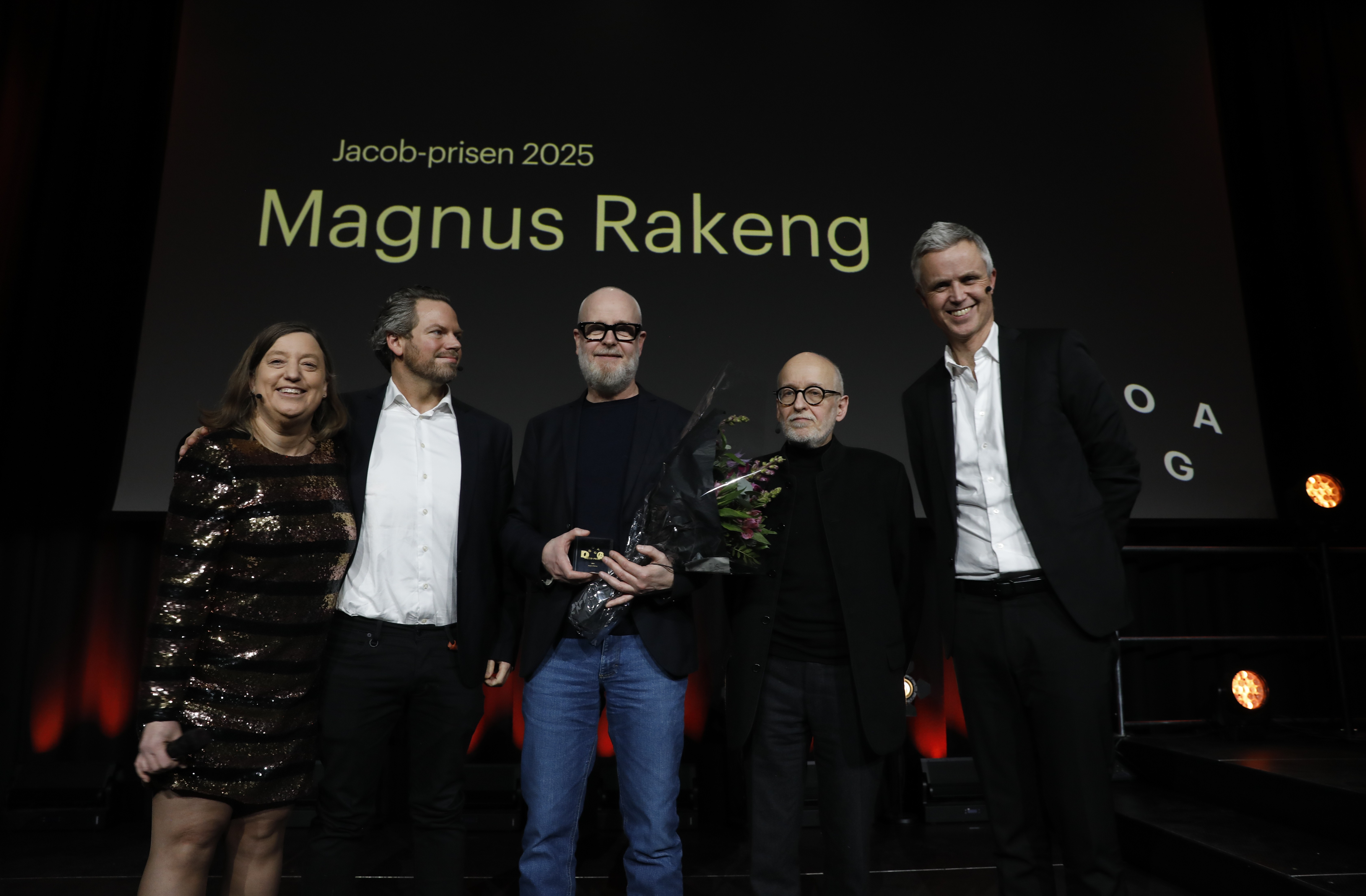 JACOB-PRISENS VINNER. Magnus Rakeng (i midten) mottok Jacob-prisen på Sentralen i Oslo 29.1.26. På bildet, fra venstre: Ellen Margrethe Skilnand (DOGA), Jon Amund Søfferud (juryleder for Jacob-prisen), Magnus Rakeng, Enzo Finger (grafisk designer), Tor Inge Hjemdal (administrerende direktør i DOGA). Foto: Sverre Chr. Jarild