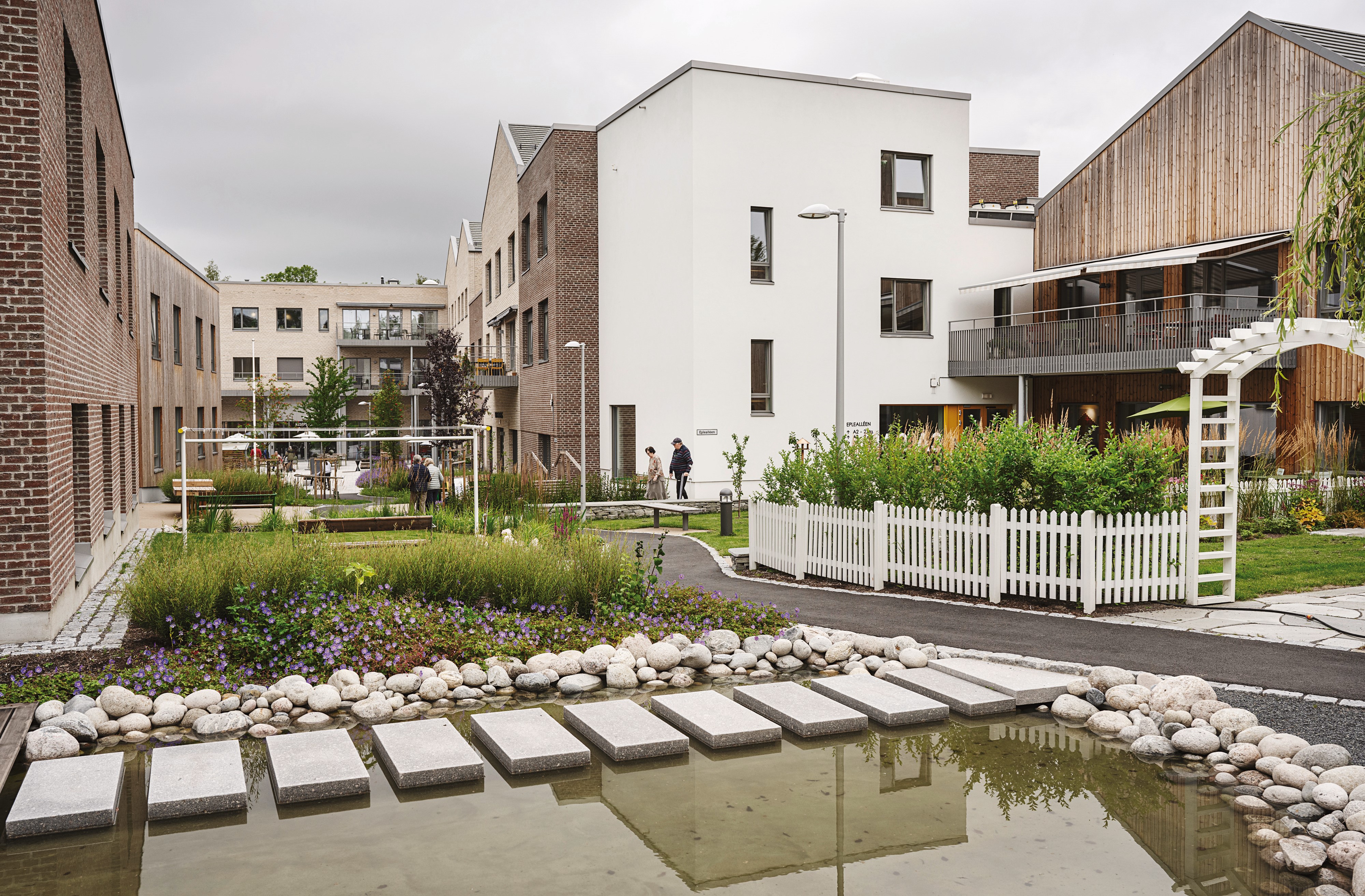 Bygningskroppene danner en naturlig avgrensning slik at beboerne kan vandre fritt i trygge omgivelser på helårs vandrerute. Langs ruten er bofelleskapene bygget med småhus- og småbypreg. Hvert hjem er unikt og har sin egen utforming og stil.