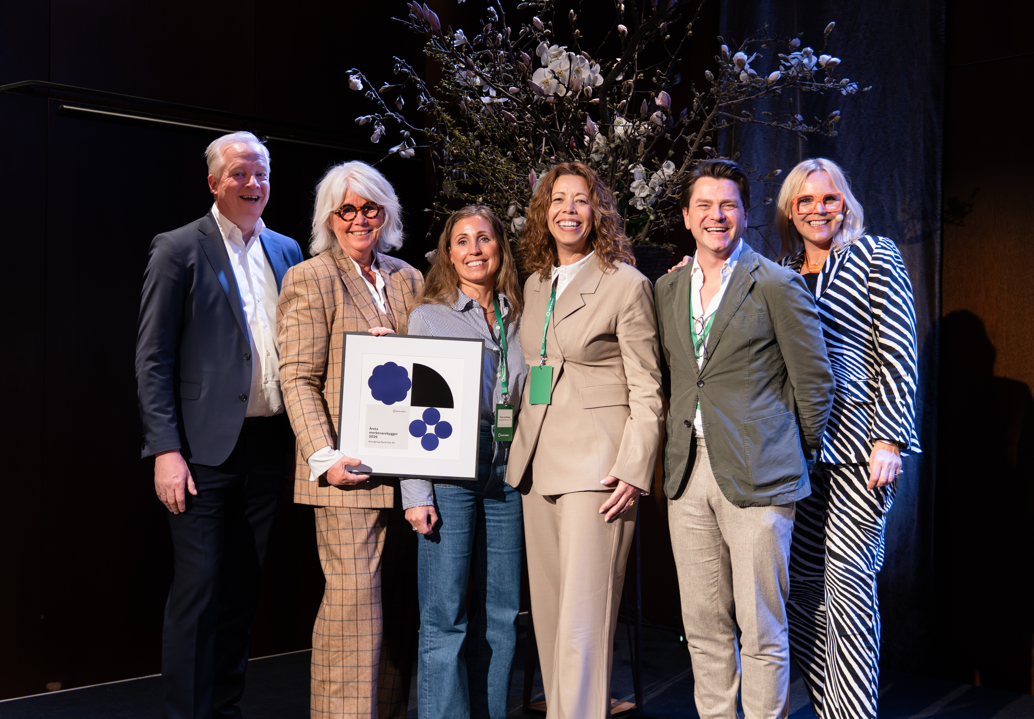GODE PÅ MERKEVARE. Norvigroup Norsk Dun kåres til Årets merkevarebygger. I midten f.v. Kari Setsaas, Therese Haltuff, Trine Lie og Pål Eid-Hviding fra Norvigroup Norsk Dun. Ytterst Egil Sundet og Ragnhild Grytten i Norsk Industri. Foto: Designindustrien