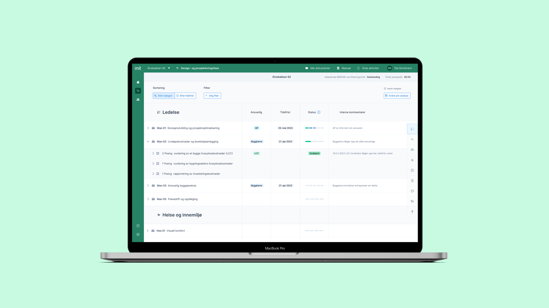 Dersom alle prosjektene i bygg- og anleggsbransjen ble miljøsertifisert, ville dette spart inn tilsvarende 6,6 prosent av Norges samlede årlige CO2-utslipp. Men fagområdet er komplisert, arbeidet tungt og prosessene klønete og gammeldagse. Løsningen er init, et digitalt og brukervennlig verktøy som gjør det enkelt å miljøsertifisere bygg.