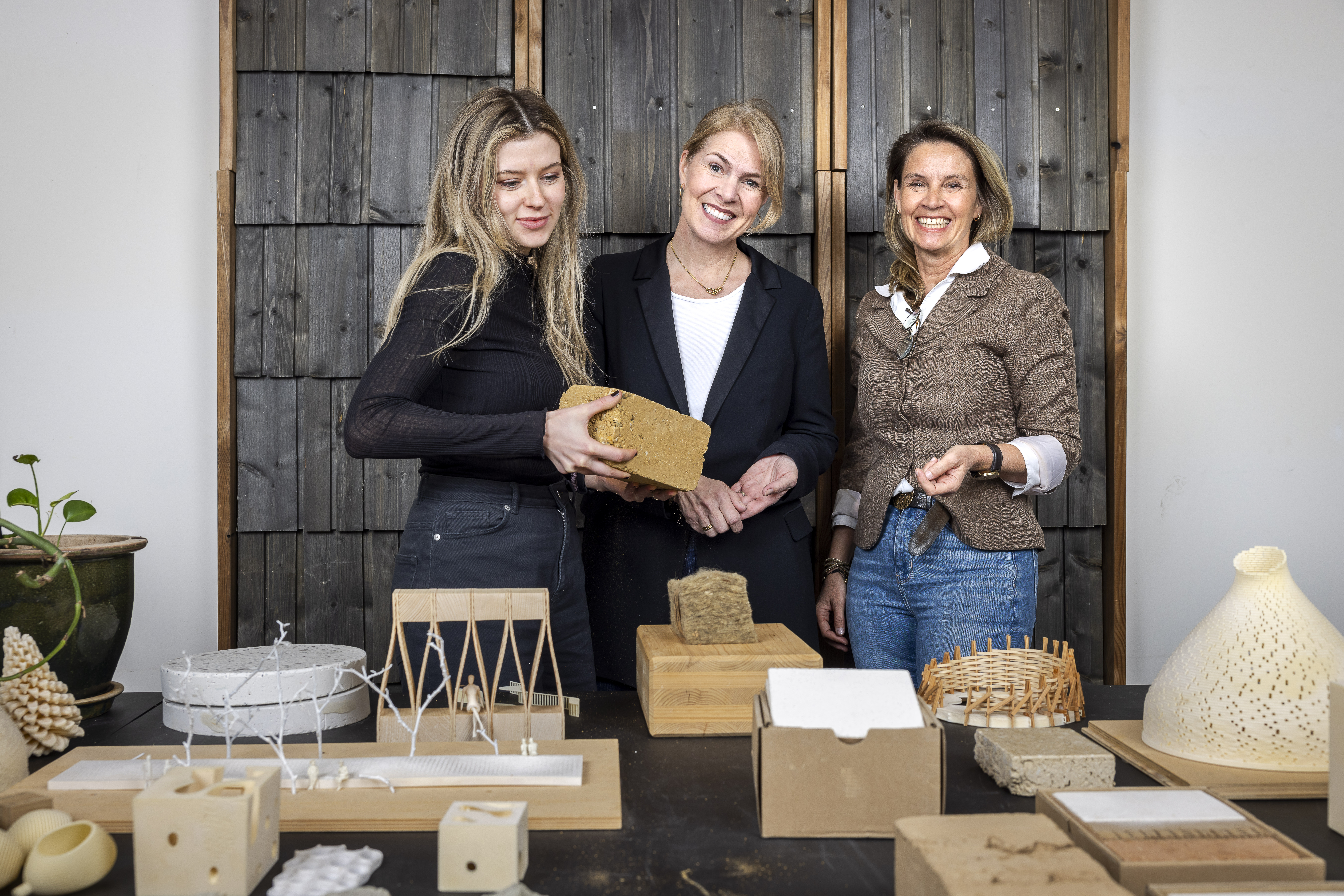 INNOVATIVE HUSBYGGERE. Etter gjennomført DIP-prosjekt som dreide seg om sirkulære ferdighus, har Haugen/Zohar Arkitekter sikret seg en strategisk viktig avtale med Norgeshus. Her viser Aleksandra Volfova (t.v.) og Marit Justine Haugen fram en veggprototype til Anne Elisabeth Bull (i midten), DIP-ansvarlig i DOGA. Foto: Morten Brakestad