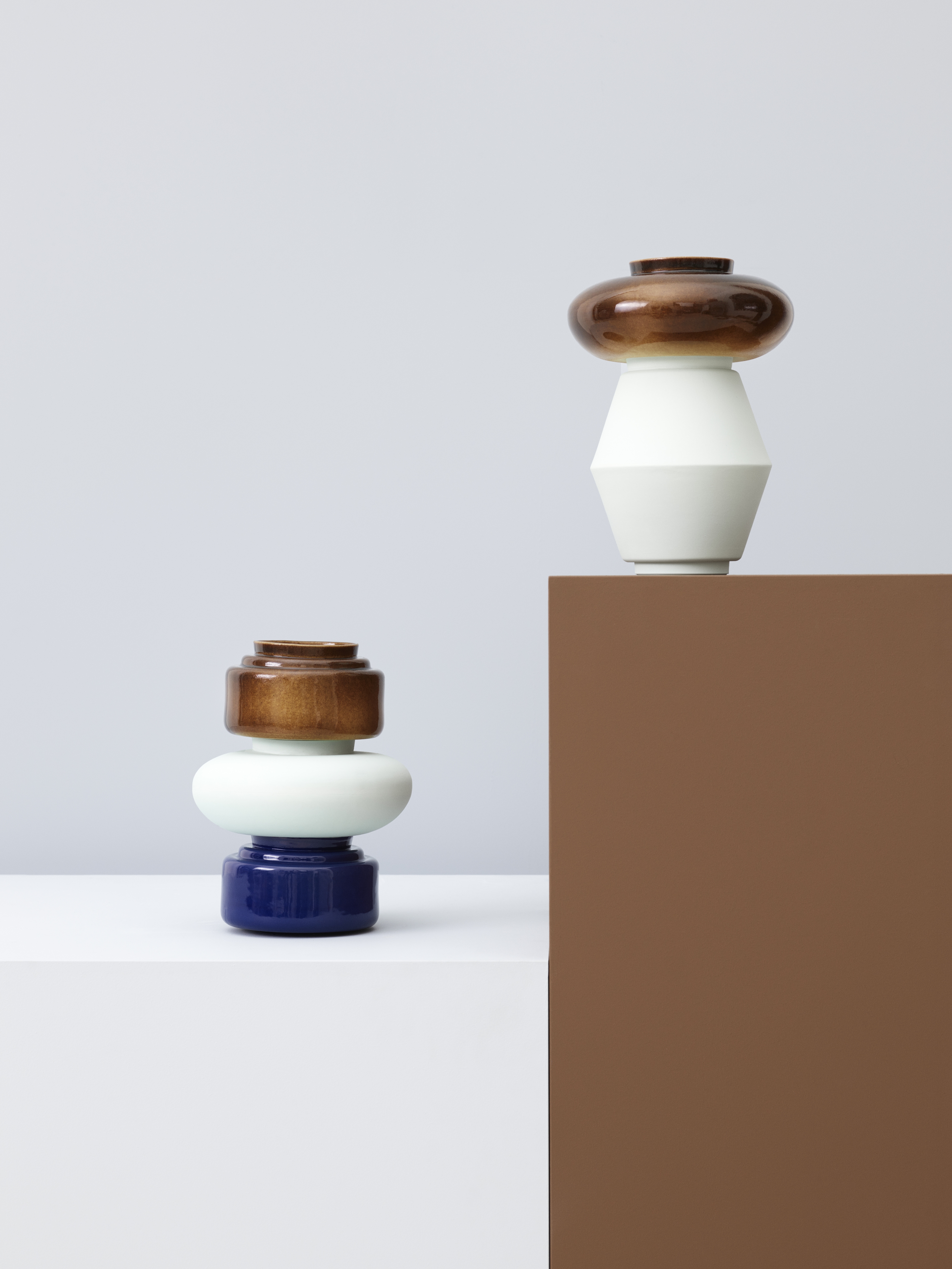 Til årets utstilling har hun med «Fam», en serie bestående av fem stablebare porselensvaser i ulike former og farger.