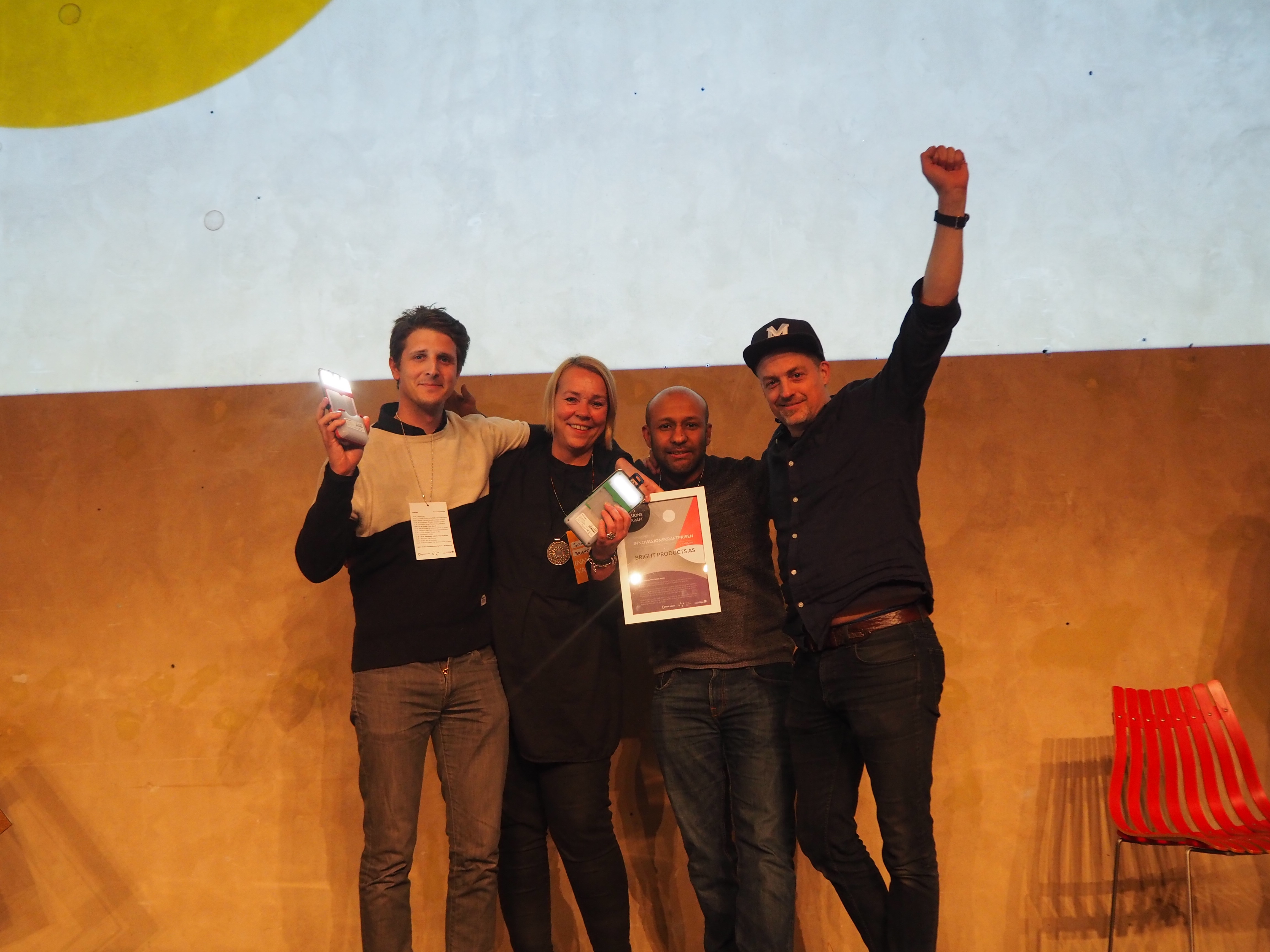 TOK IMOT PRIS. Representanter for Bright Products jubler over prisen. Fra venstre, Olivier Butstraen, Selma Kveim, Mohammed Yassin og Marius Andresen, sistnevnte fra K8 Industridesign Foto: Cathrine Westlie Eidal