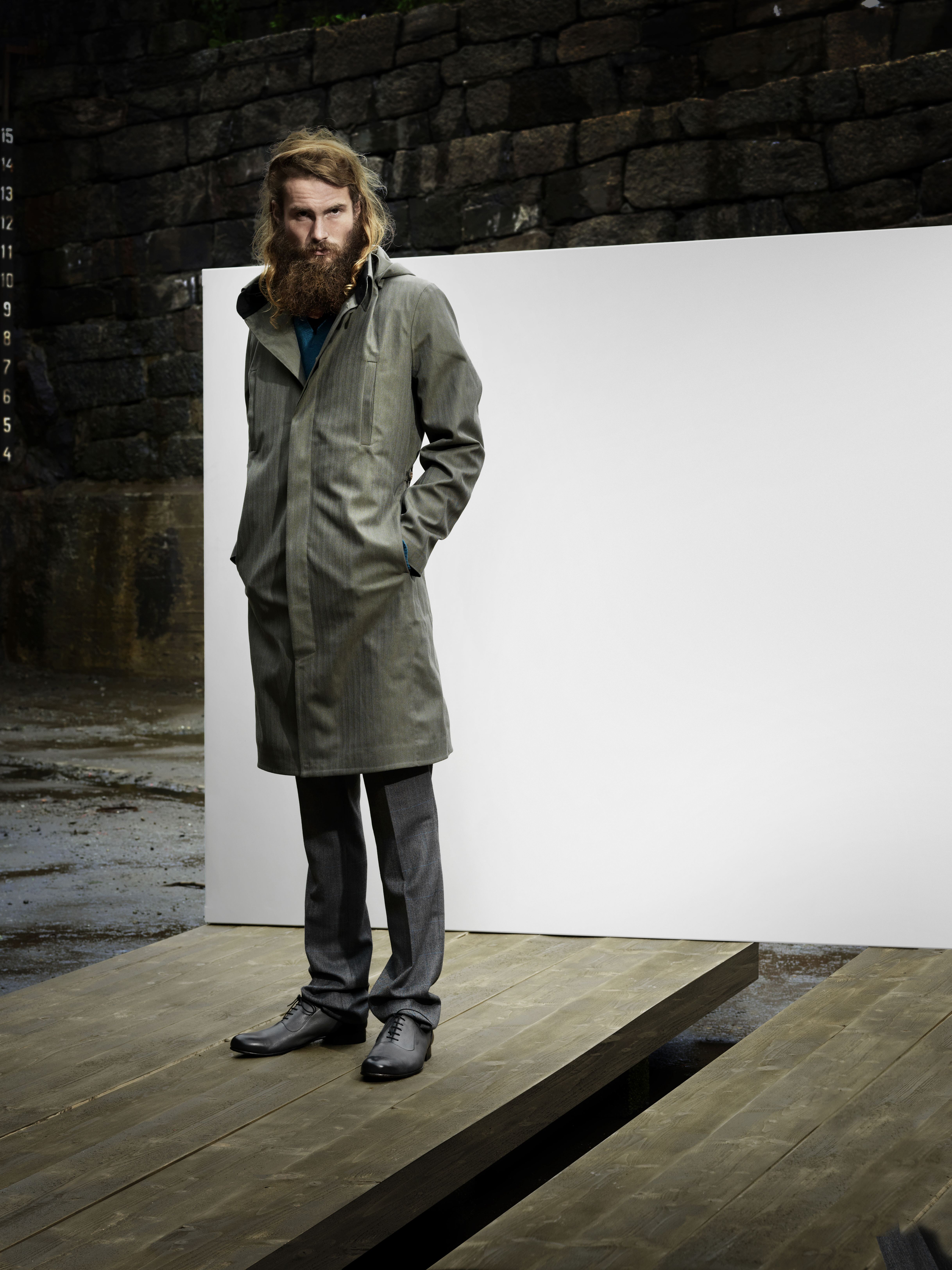 URBANE REGNFRAKKER: Norwegian Rain er nominert til Hedersprisen for god design for sin regnbekledning for urbane menn. Hvem som vinner blir klart på Designdagen onsdag 18. april. Foto: Magne Sandnes / Grandpeople