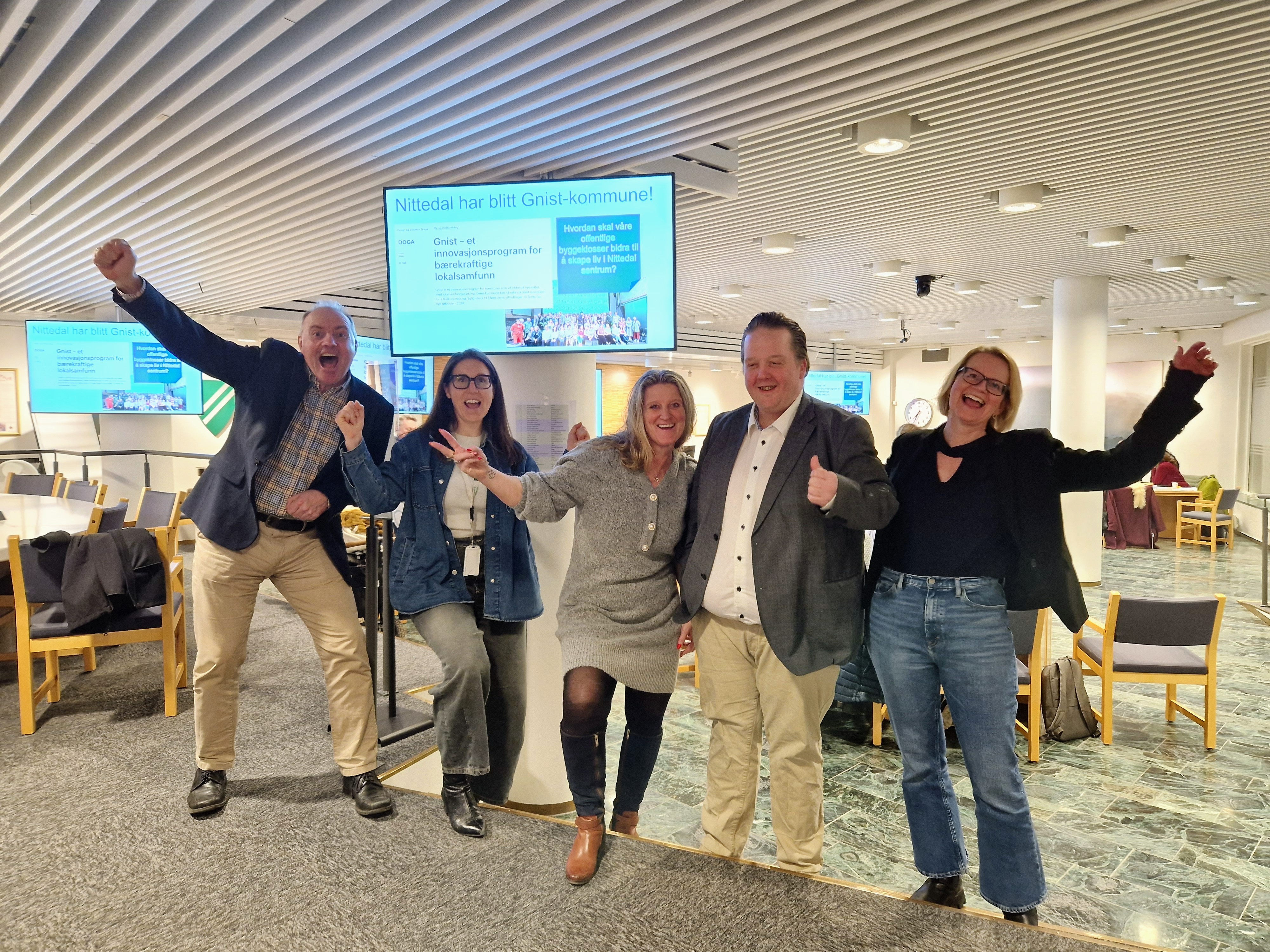 JUBEL. Så glade ble de i Nittedal da de fikk vite at de er valgt ut som Gnist-kommune i 2025. F.v. ordfører Rune Winum, arkitekt Nicole Holmeseth-Martin, kommunaldirektør Adelheid Buschmann-Kristiansen, planutvalgsleder Helge Fossum og arealplanlegger Kjersti Gakkestad. Foto: Matti Lucie Arentz/DOGA