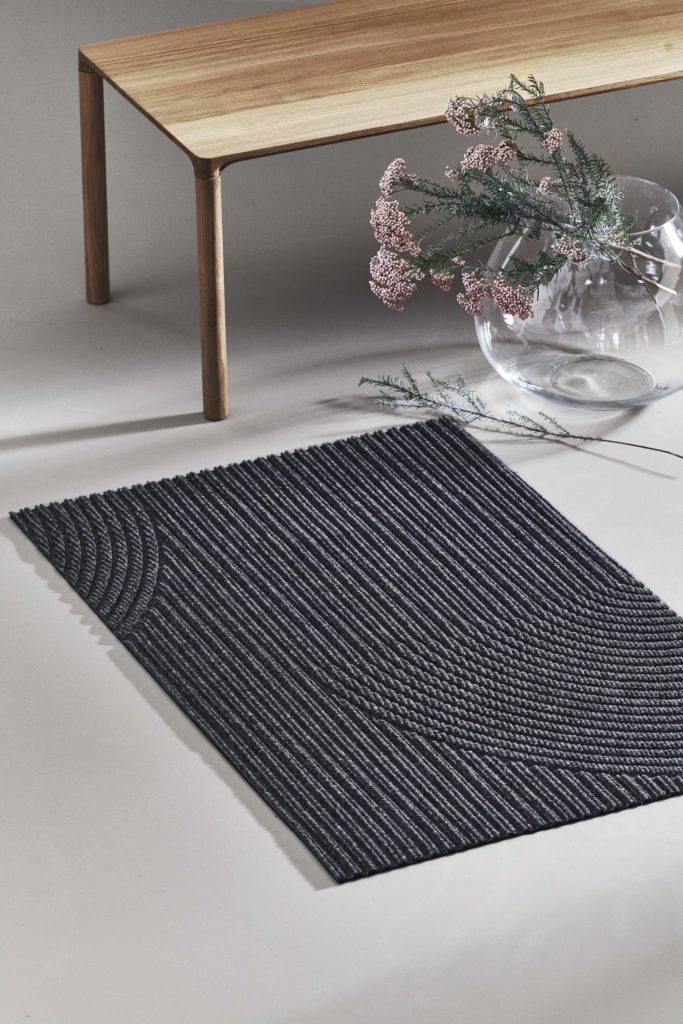 Designeren Kristine Five Melvær har formgitt matten Stein for Heymat. Matten er en del av serien Heymat+, og er laget av resirkulert plast.