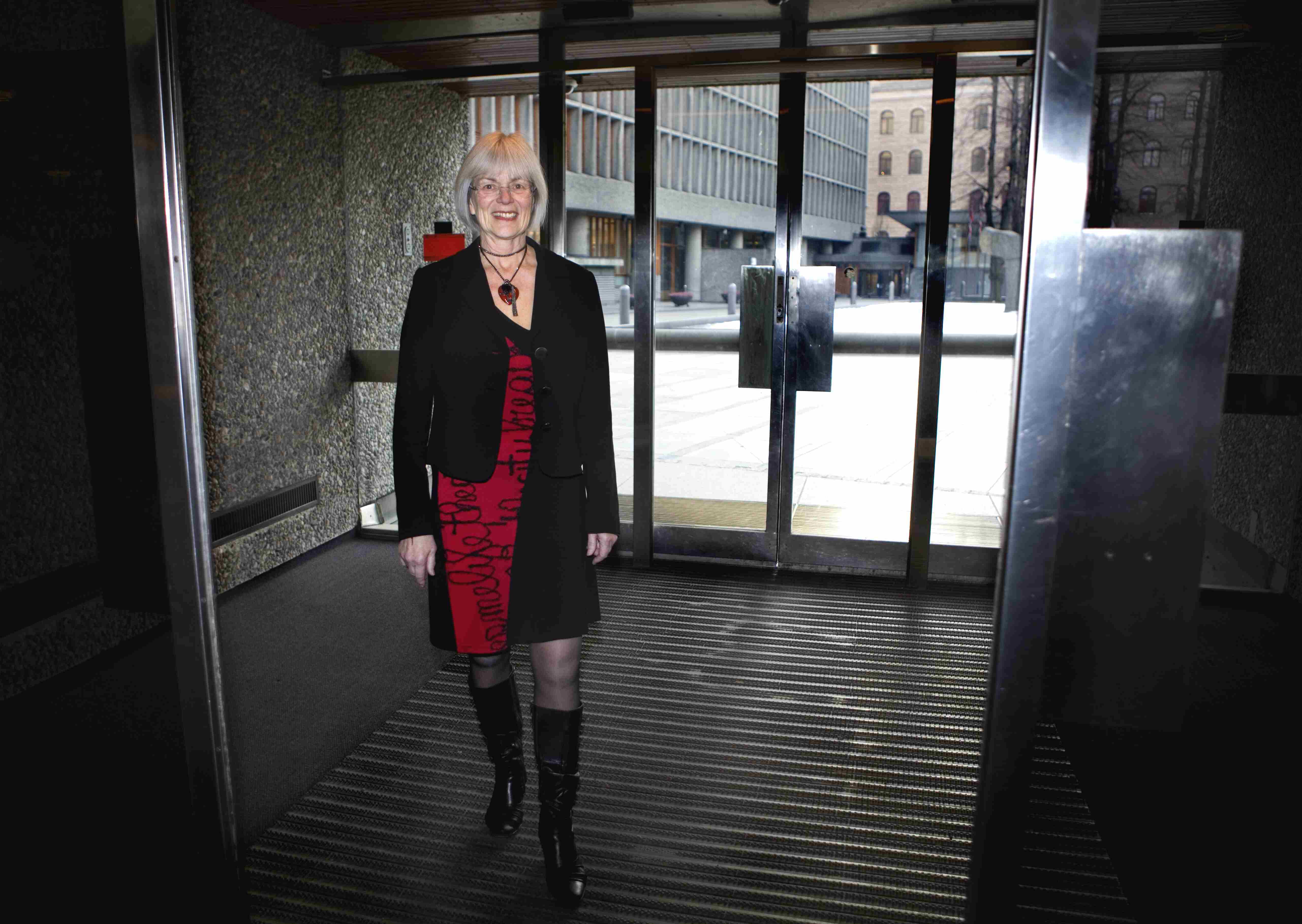 FOR ALLE: – Automatiske dører er et eksempel på universell utforming som gjør hverdagen enklere for alle, sier konstituert barne-, likestillings- og inkluderingsminister Tora Aasland, her utenfor sitt departement.Foto: Johnny Syversen