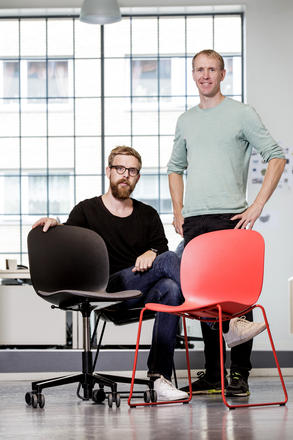 Jonas Ravlo Stokke og Øystein Austad i designstudioet StokkeAustad med salgssuksessen RBM Noor, som de skal vise fram i London under 100% Norway 2014. Foto: nyebilder.no