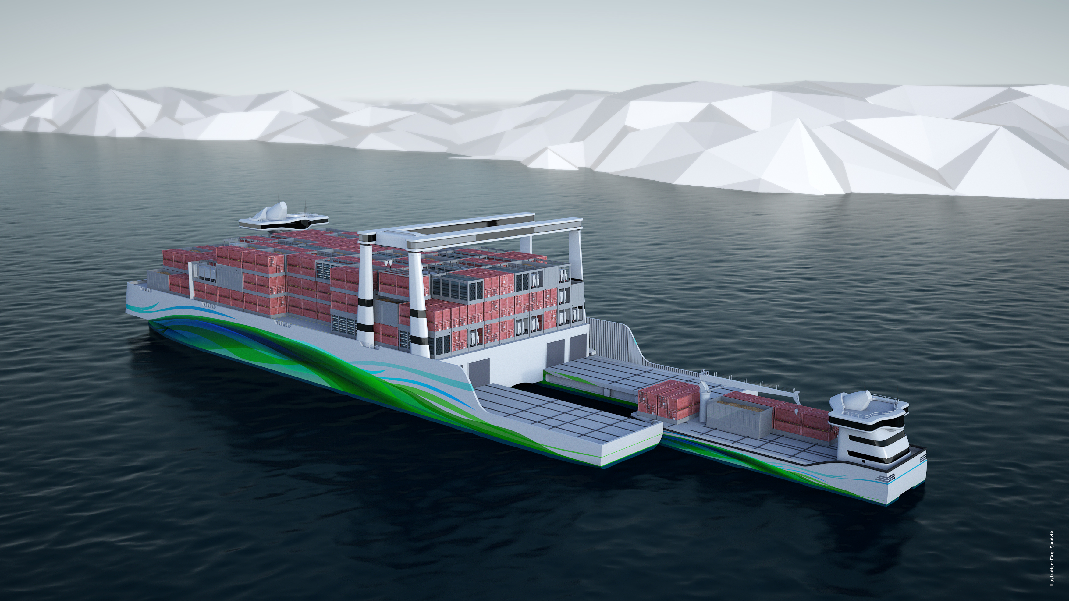 – Dette er en radikal innovasjon som kan revolusjonere godstransporten til havs. Ved hjelp av en 2-fartøysløsning kan store godsmengder transporteres langs norskekysten uten at havnene blir overrent av store skip. I stedet er det et lite datterskip som tar seg av den siste transportetappen, sier Skule Storheill, direktør for FoU og innovasjon ved Norsk design- og arkitektursenter.