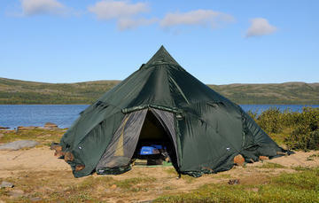 – Resultatet er et telt som har 20 prosent mer sittehøydeplass enn en lavvo med tilsvarende grunnflate. Samtidig går det an å heise sideveggene for utsikt og lufting, og teltet står svært stødig selv i sterk vind, forklarer Flem.
