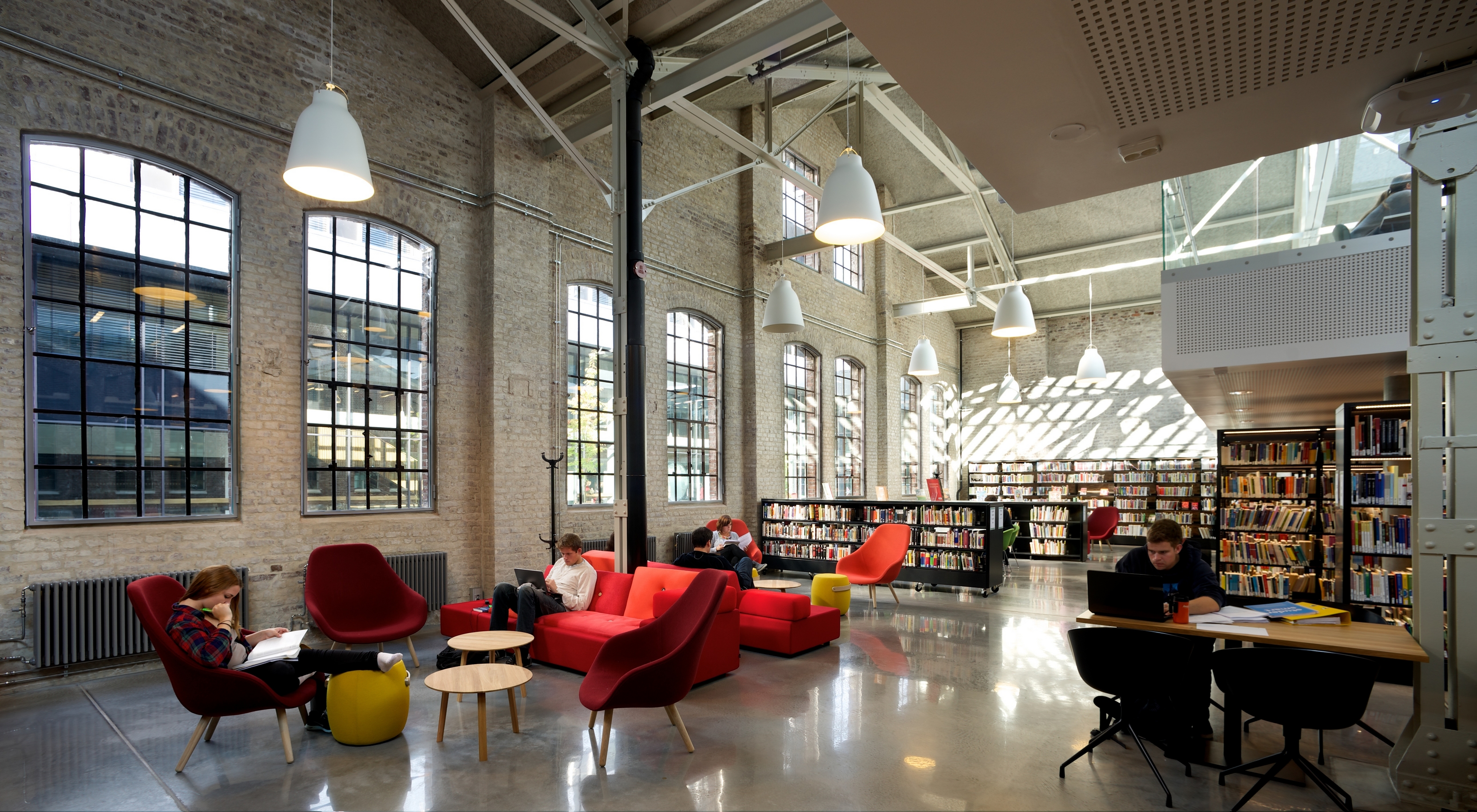 AKTIV LÆRING. Høgskolen i Bergen, nå Høgskulen på Vestlandet, mottok kategoripris for møbel og interiør i 2014. Bildet viser biblioteket slik det fremsto det året. Foto: Pål Hoff